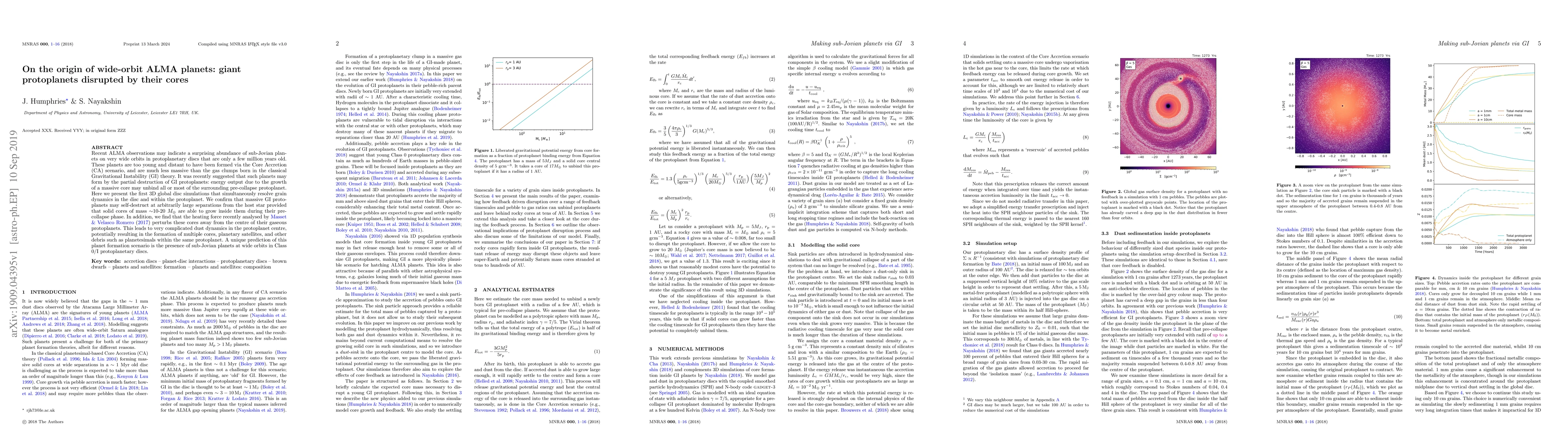 Recent ALMA observations may indicate a surprising abundance of sub-Jovian planets on very wide orbits in protoplanetary discs that are only a few million years old. These planets are too young and distant to have been formed via the Core Accretion (CA) scenario, and are much less massive than the gas clumps born in the classical Gravitational Instability (GI) theory. It was recently suggested that such planets may form by the partial destruction of GI protoplanets: energy output due to the growth of a massive core may unbind all or most of the surrounding pre-collapse protoplanet. Here we present the first 3D global disc simulations that simultaneously resolve grain dynamics in the disc and within the protoplanet. We confirm that massive GI protoplanets may self-destruct at arbitrarily large separations from the host star provided that solid cores of mass around 10-20 Earth masses are able to grow inside them during their pre-collapse phase. In addition, we find that the heating force recently analysed by Masset and Velasco Romero (2017) perturbs these cores away from the centre of their gaseous protoplanets. This leads to very complicated dust dynamics in the protoplanet centre, potentially resulting in the formation of multiple cores, planetary satellites, and other debris such as planetesimals within the same protoplanet. A unique prediction of this planet formation scenario is the presence of sub-Jovian planets at wide orbits in Class 0/I protoplanetary discs.