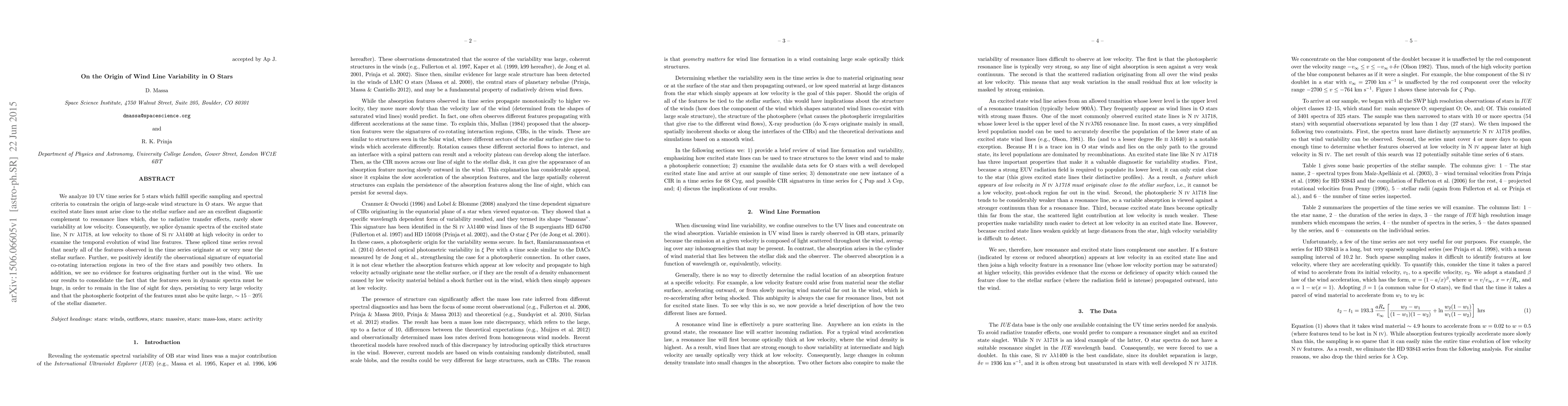 This study analyzes UV time series of O stars, finding that wind line variability originates close to the stellar surface, supported by the use of excited state lines as diagnostics. The research identifies equatorial co-rotating interaction regions in some stars and concludes that observed wind features are large, persisting for days and extending far into the wind.