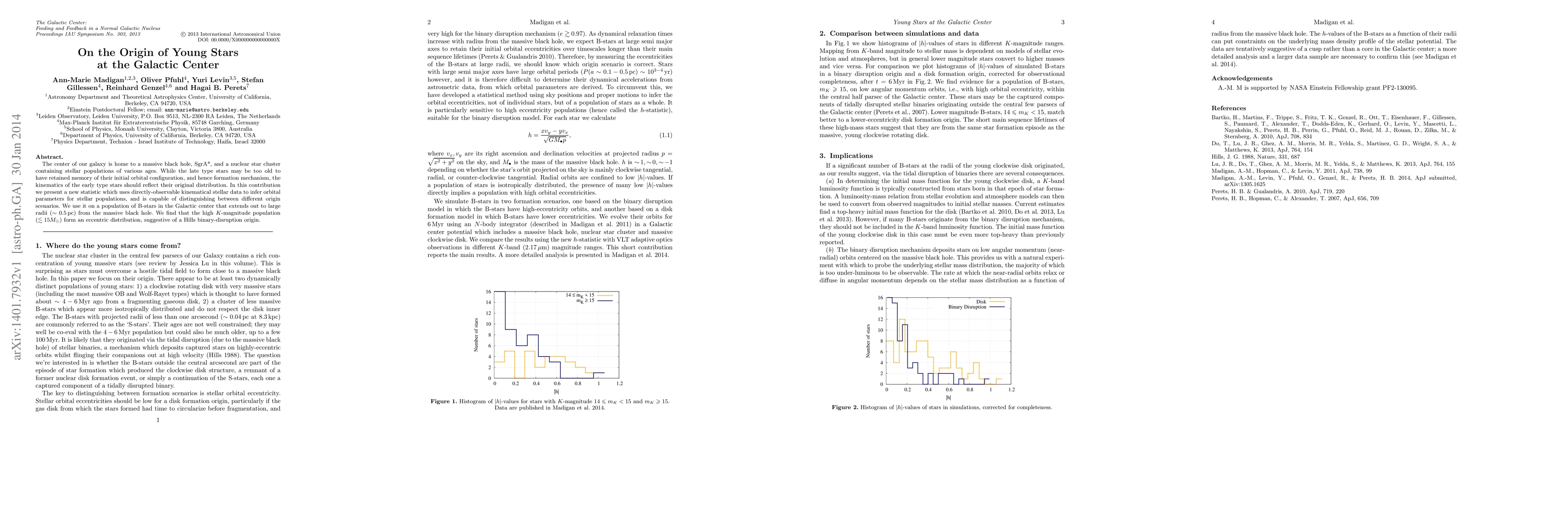 The center of our galaxy is home to a massive black hole, SgrA*, and a nuclear star cluster containing stellar populations of various ages. While the late type stars may be too old to have retained memory of their initial orbital configuration, and hence formation mechanism, the kinematics of the early type stars should reflect their original distribution. In this contribution we present a new statistic which uses directly-observable kinematical stellar data to infer orbital parameters for stellar populations, and is capable of distinguishing between different origin scenarios. We use it on a population of B-stars in the Galactic center that extends out to large radii (0.5 pc) from the massive black hole. We find that the high K-magnitude population form an eccentric distribution, suggestive of a Hills binary-disruption origin.