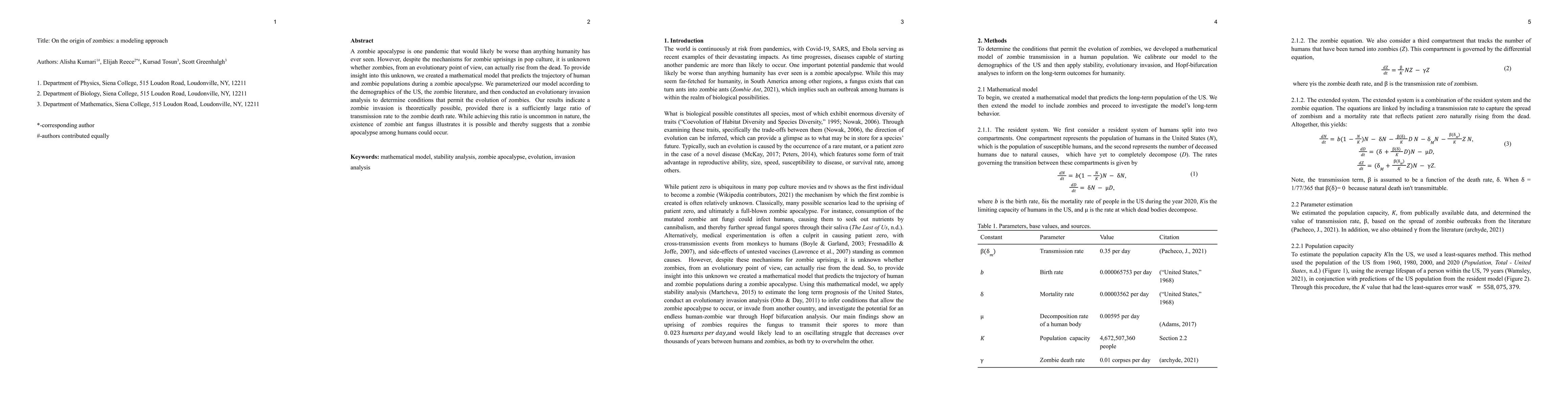A zombie apocalypse is one pandemic that would likely be worse than anything humanity has ever seen. However, despite the mechanisms for zombie uprisings in pop culture, it is unknown whether zombies, from an evolutionary point of view, can actually rise from the dead. To provide insight into this unknown, we created a mathematical model that predicts the trajectory of human and zombie populations during a zombie apocalypse. We parameterized our model according to the demographics of the US, the zombie literature, and then conducted an evolutionary invasion analysis to determine conditions that permit the evolution of zombies. Our results indicate a zombie invasion is theoretically possible, provided there is a sufficiently large ratio of transmission rate to the zombie death rate. While achieving this ratio is uncommon in nature, the existence of zombie ant fungus illustrates it is possible and thereby suggests that a zombie apocalypse among humans could occur.