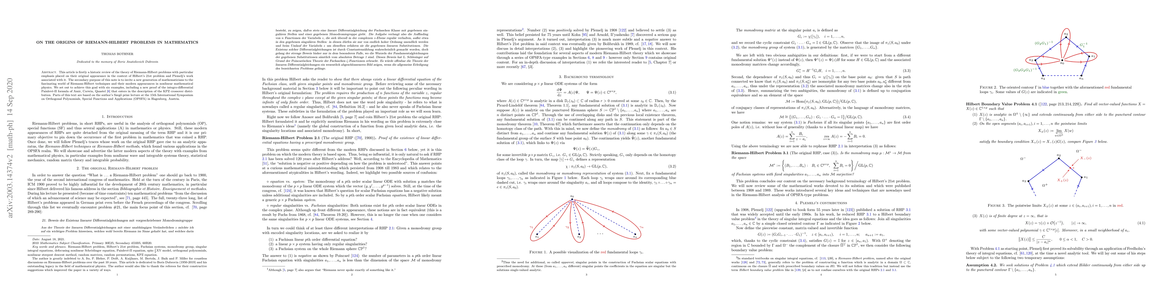 This research paper reviews the history of Riemann-Hilbert problems in mathematics, focusing on their origins with Hilbert's 21st problem, and introduces these techniques to a new generation of mathematicians through six examples.