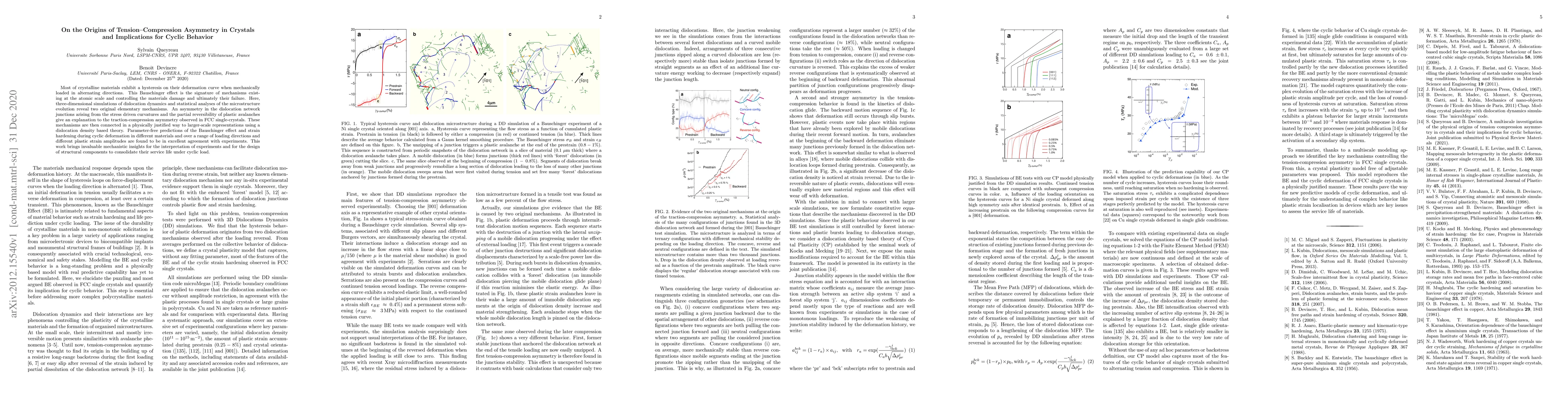 Most of crystalline materials exhibit a hysteresis on their deformation curve when mechanically loaded in alternating directions. This Bauschinger effect is the signature of mechanisms existing at the atomic scale and controlling the materials damage and ultimately their failure. Here, three-dimensional simulations of dislocation dynamics and statistical analyses of the microstructure evolution reveal two original elementary mechanisms. An asymmetry in the dislocation network junctions arising from the stress driven curvatures and the partial reversibility of plastic avalanches give an explanation to the traction-compression asymmetry observed in FCC single-crystals. These mechanisms are then connected in a physically justified way to larger-scale representations using a dislocation density based theory. Parameter-free predictions of the Bauschinger effect and strain hardening during cyclic deformation in different materials and over a range of loading directions and different plastic strain amplitudes are found to be in excellent agreement with experiments. This work brings invaluable mechanistic insights for the interpretation of experiments and for the design of structural components to consolidate their service life under cyclic load.