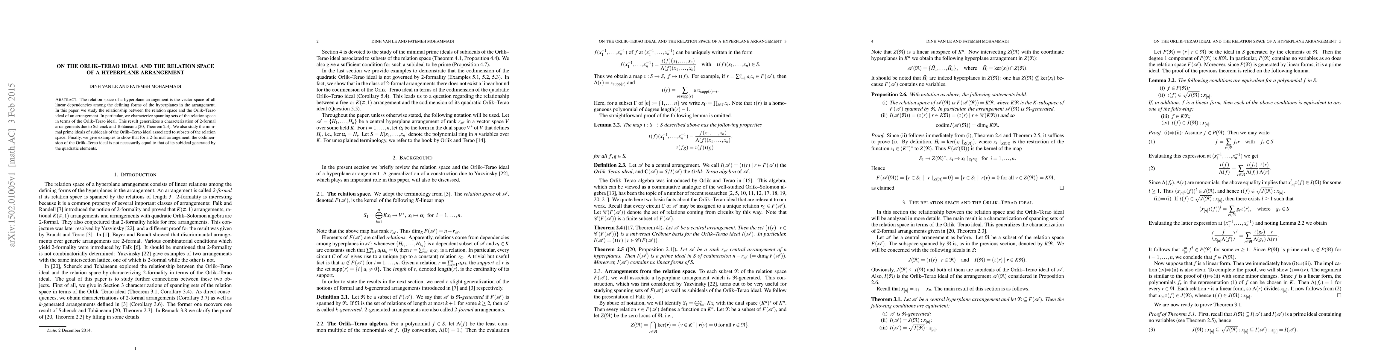 This paper investigates the relationship between the relation space of a hyperplane arrangement and its associated Orlik-Terao ideal, providing a characterization of spanning sets in terms of the ideal. It also examines minimal prime ideals of subideals linked to subsets of the relation space, illustrating that for 2-formal arrangements, the codimension of the Orlik-Terao ideal may differ from that of its quadratic subideal.