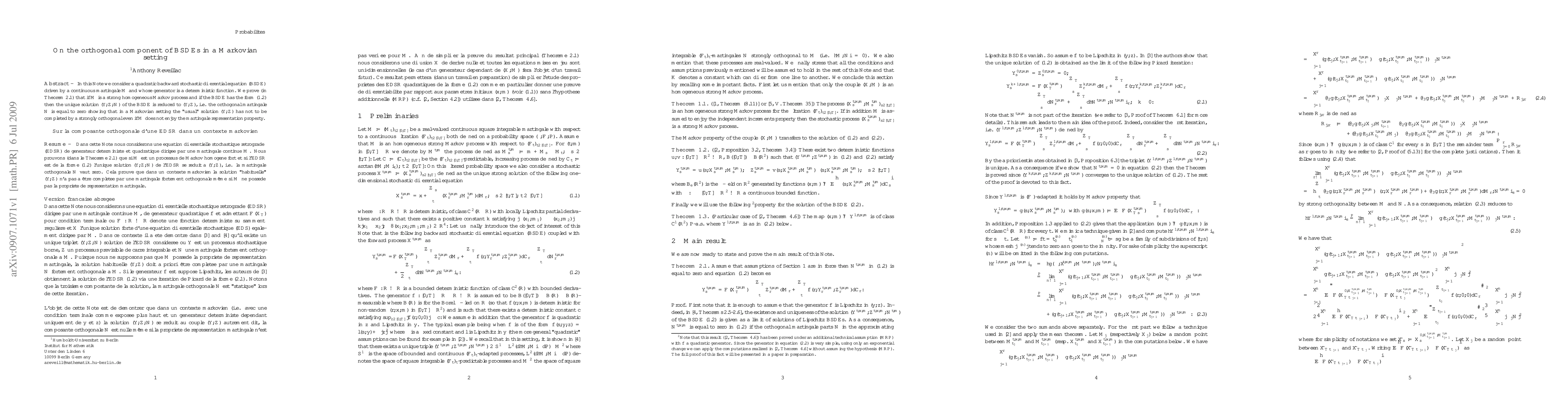 In a Markovian setting, a quadratic BSDE can have a unique solution without an orthogonal component, eliminating the need for completing the solution with a strongly orthogonal martingale.