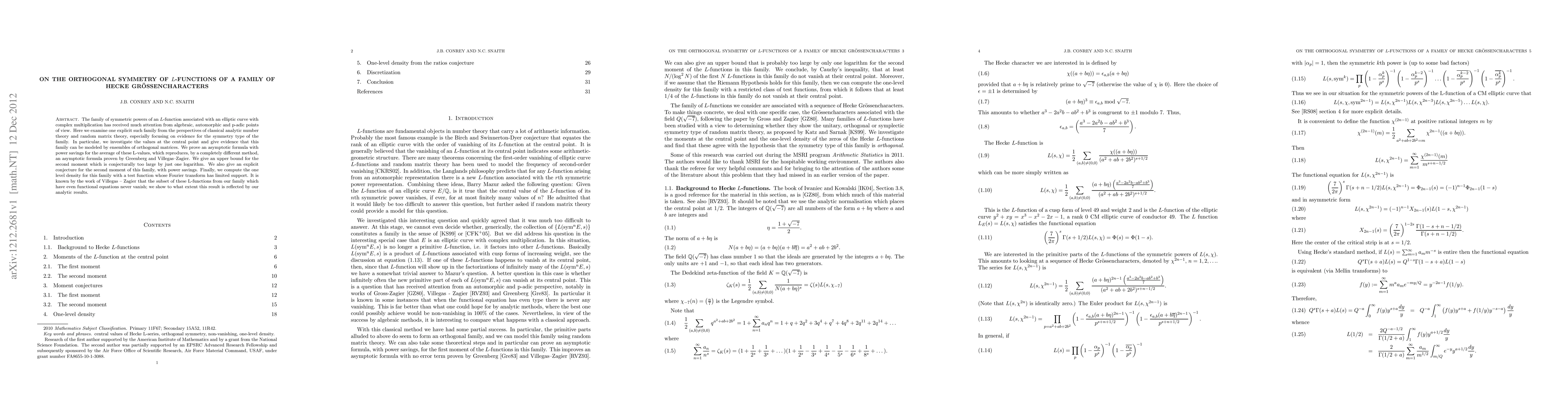 This paper investigates the orthogonal symmetry of $L$-functions associated with a family of Hecke Grössencharacters, providing evidence that these functions can be modeled by orthogonal matrices. It proves an asymptotic formula for the average of these $L$-values and gives an explicit conjecture for the second moment, while also computing the one level density for the family.