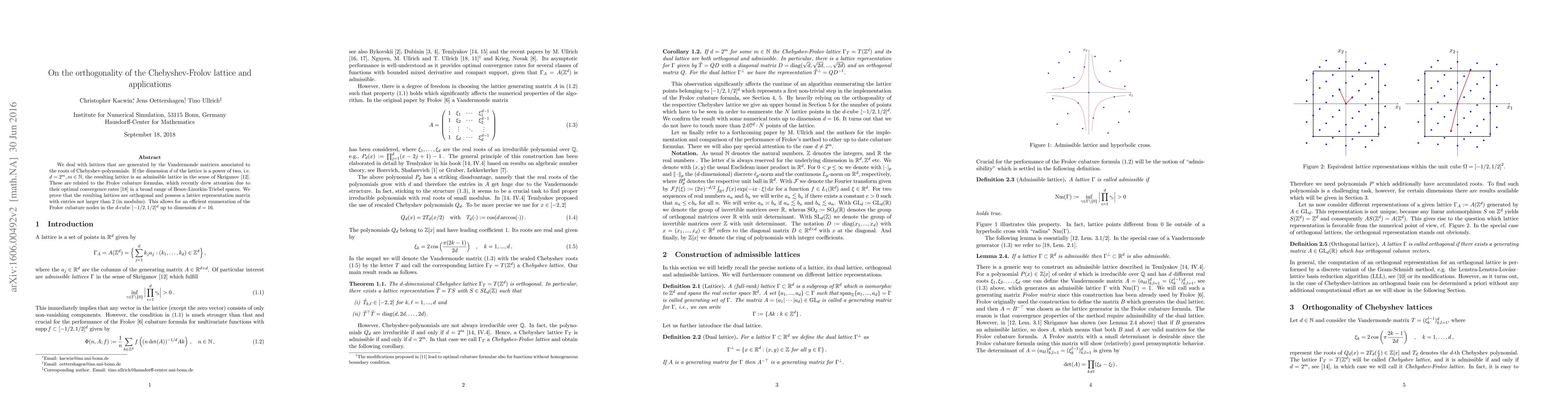 We deal with lattices that are generated by the Vandermonde matrices associated to the roots of Chebyshev-polynomials. If the dimension $d$ of the lattice is a power of two, i.e. $d=2^m, m \in \mathbb{N}$, the resulting lattice is an admissible lattice in the sense of Skriganov. Those are related to the Frolov cubature formulas, which recently drew attention due to their optimal convergence rates in a broad range of function spaces with mixed smoothness. We prove that the resulting lattices are orthogonal and possess a lattice representation matrix with entries not larger than $2$ (in modulus). This allows for an efficient enumeration of the Frolov cubature nodes in the $d$-cube $[-1/2,1/2]^d$ up to dimension $d=16$.