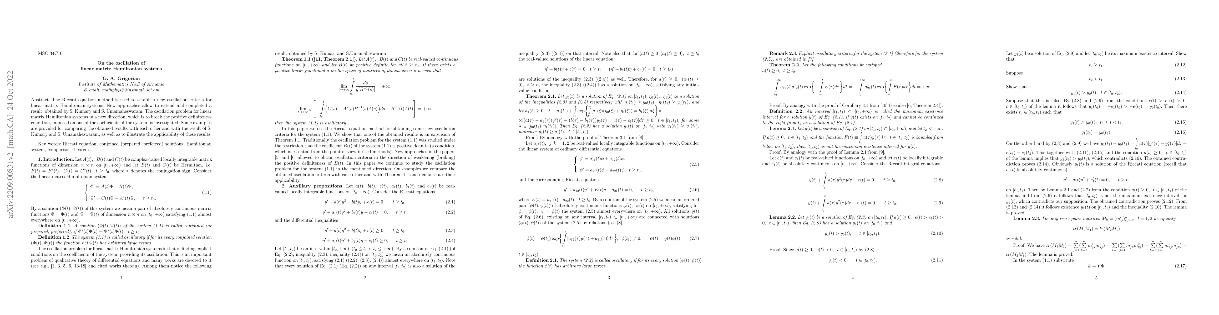 The Riccati equation method is used to establish new oscillation criteria for linear matrix Hamiltonian systems. New approaches allow to extend and completed a result, obtained by S. Kumary and S. Umamaheswaram. The oscillation problem for linear matrix Hamiltonian systems in a new direction, which is to break the positive definiteness condition, imposed on one of the coeffcients of the system, is investigated. Some examples are provided for comparing the obtained results with each other and with the result of S. Kumary and S. Umamaheswaram, as well as to illustrate the applicability of these results.