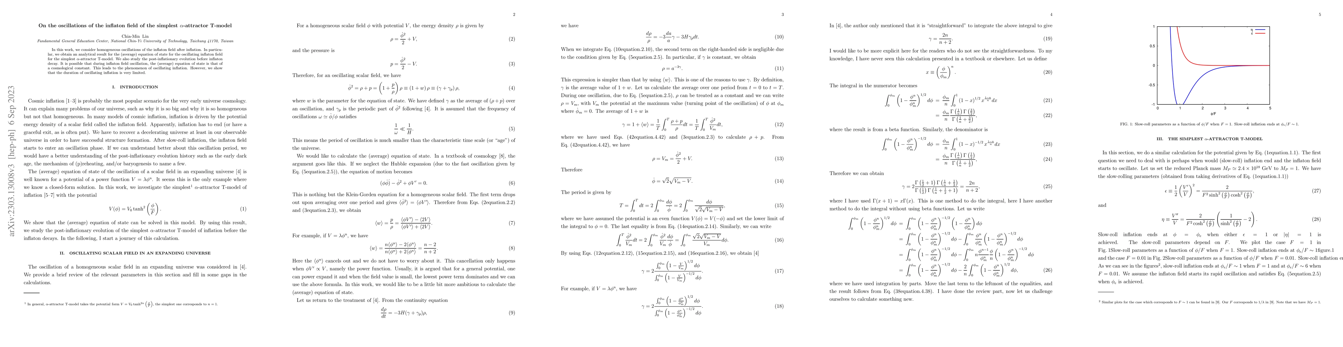 This paper analyzes the homogeneous oscillations of the inflaton field in the simplest $\alpha$-attractor T-model, deriving an analytical equation of state for the oscillating field. It finds that while oscillating inflation may occur briefly, its duration is limited.