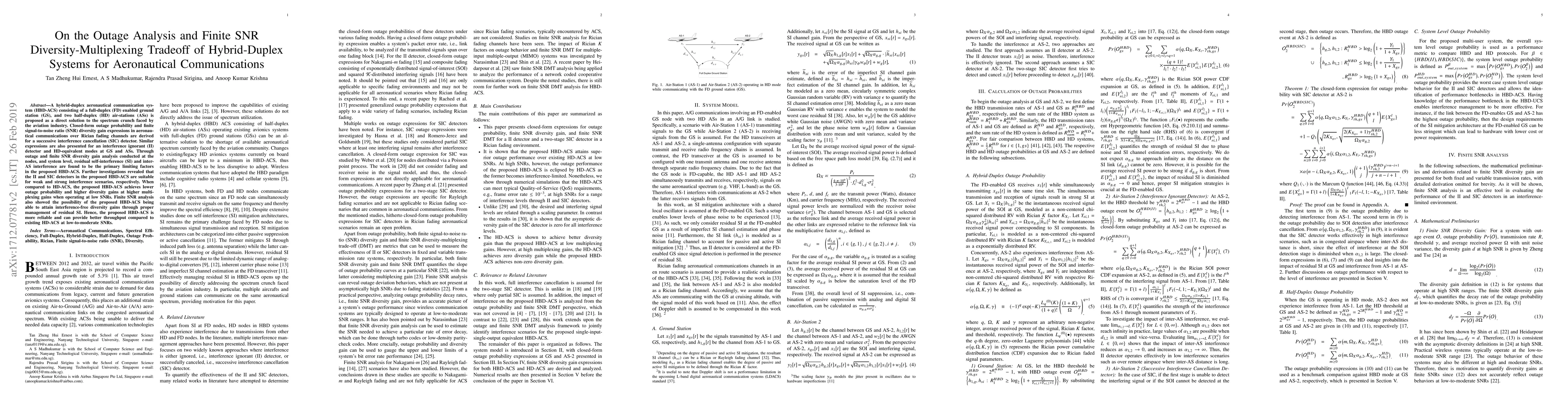 A hybrid-duplex aeronautical communication system (HBD-ACS) consisting of a full-duplex (FD) enabled ground station (GS), and two half-duplex (HD) air-stations (ASs) is proposed as a direct solution to the spectrum crunch faced by the aviation industry. Closed-form outage probability and finite signal-to-noise ratio (SNR) diversity gain expressions in aeronautical communications over Rician fading channels are derived for a successive interference cancellation (SIC) detector. Similar expressions are also presented for an interference ignorant (II) detector and HD-equivalent modes at GS and ASs. Through outage and finite SNR diversity gain analysis conducted at the nodes, and system level, residual SI and inter-AS interference are found to be the primary limiting factors in the proposed HBD-ACS. Additional analysis also revealed that the II and SIC detectors in the proposed HBD-ACS are suitable for weak and strong interference scenarios, respectively. When compared to HD-ACS, the proposed HBD-ACS achieves lower outage probability and higher diversity gains at higher multiplexing gains when operating at low SNRs. Finite SNR analysis also showed the possibility of the proposed HBD-ACS being able to attain interference-free diversity gains through proper management of residual SI. Hence, the proposed HBD-ACS is more reliable and can provide better throughput compared to existing HD-ACS at low-to-moderate SNRs.