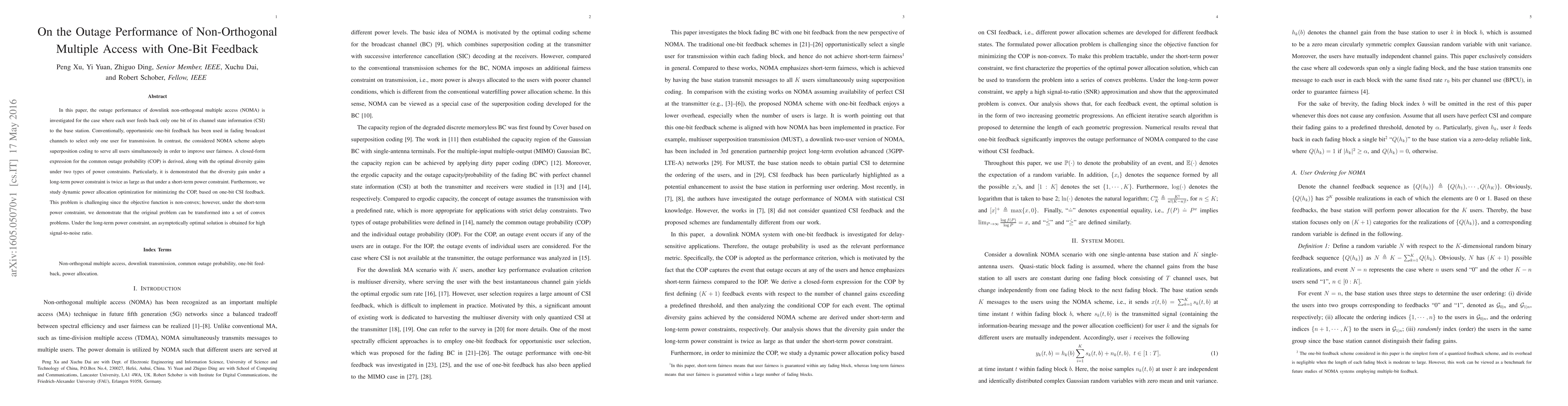 This paper investigates the outage performance of downlink non-orthogonal multiple access (NOMA) with one-bit channel state information (CSI) feedback, deriving a closed-form expression for common outage probability and optimal diversity gains under different power constraints. It also addresses dynamic power allocation optimization to minimize the common outage probability, transforming the non-convex problem into convex problems under short-term constraints and finding an asymptotically optimal solution under long-term constraints.
