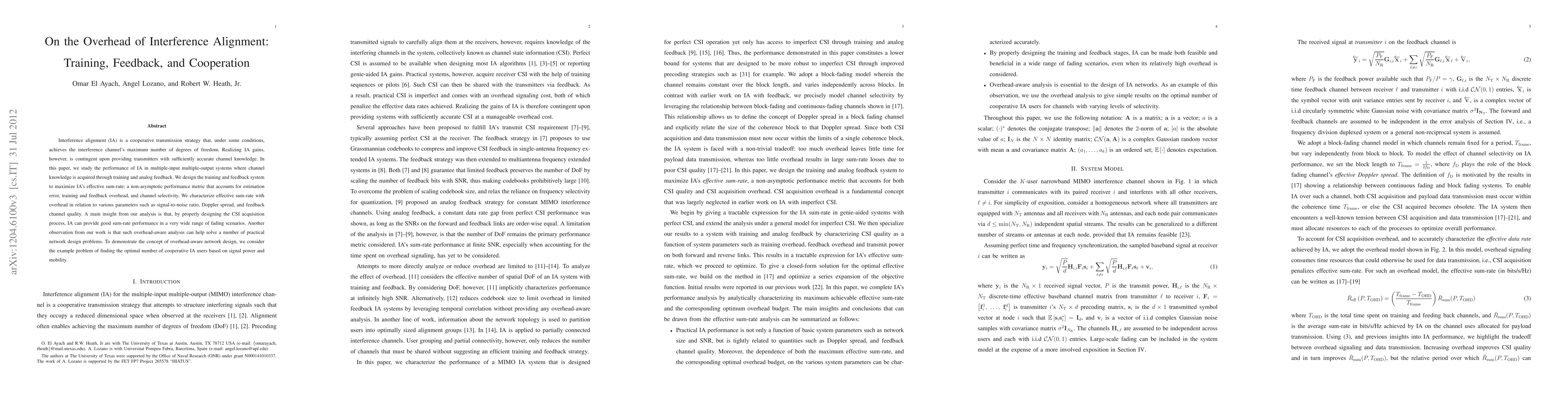 This paper investigates the overhead associated with interference alignment (IA) in multiple-input multiple-output systems, focusing on training and feedback mechanisms for channel knowledge acquisition. It demonstrates that optimized CSI acquisition can maintain good sum-rate performance across diverse fading conditions, and highlights the utility of overhead-aware analysis in practical network design, such as determining the optimal number of cooperative IA users.