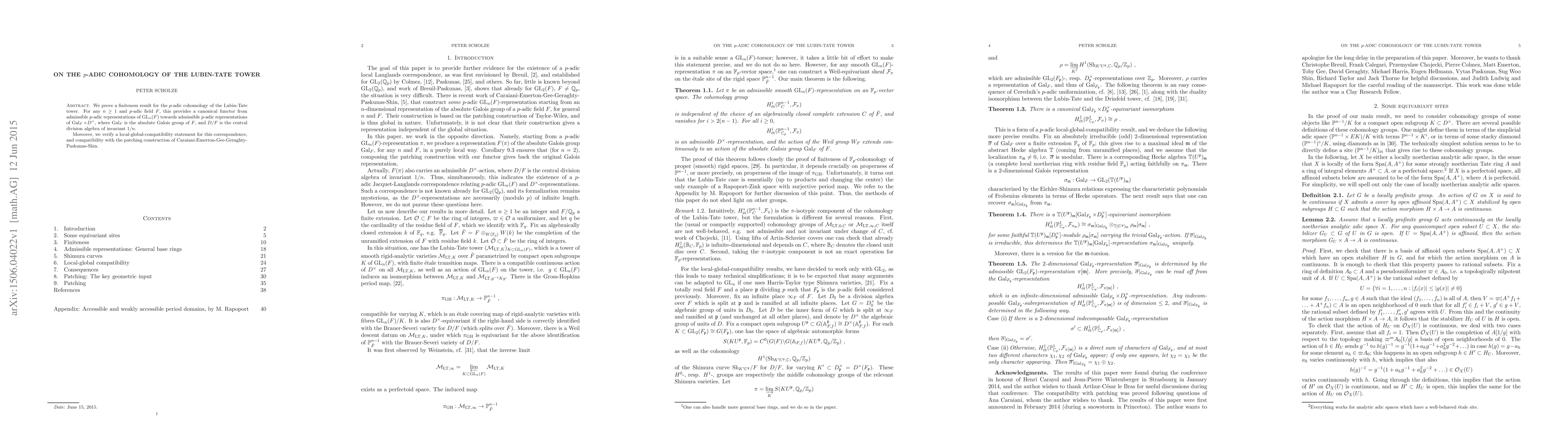 This paper establishes a finiteness result for the p-adic cohomology of the Lubin-Tate tower and introduces a canonical functor linking p-adic representations of GL_n(F) with those of Gal_F x D^*. It also confirms local-global compatibility and aligns with the patching construction from recent works.