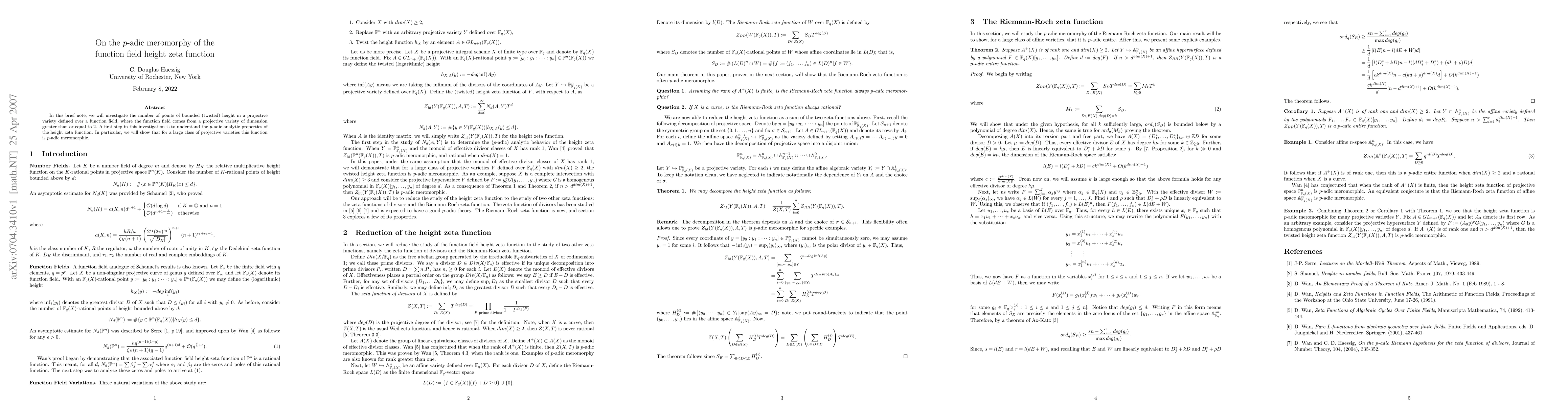 In this brief note, we will investigate the number of points of bounded (twisted) height in a projective variety defined over a function field, where the function field comes from a projective variety of dimension greater than or equal to 2. A first step in this investigation is to understand the $p$-adic analytic properties of the height zeta function. In particular, we will show that for a large class of projective varieties this function is $p$-adic meromorphic.