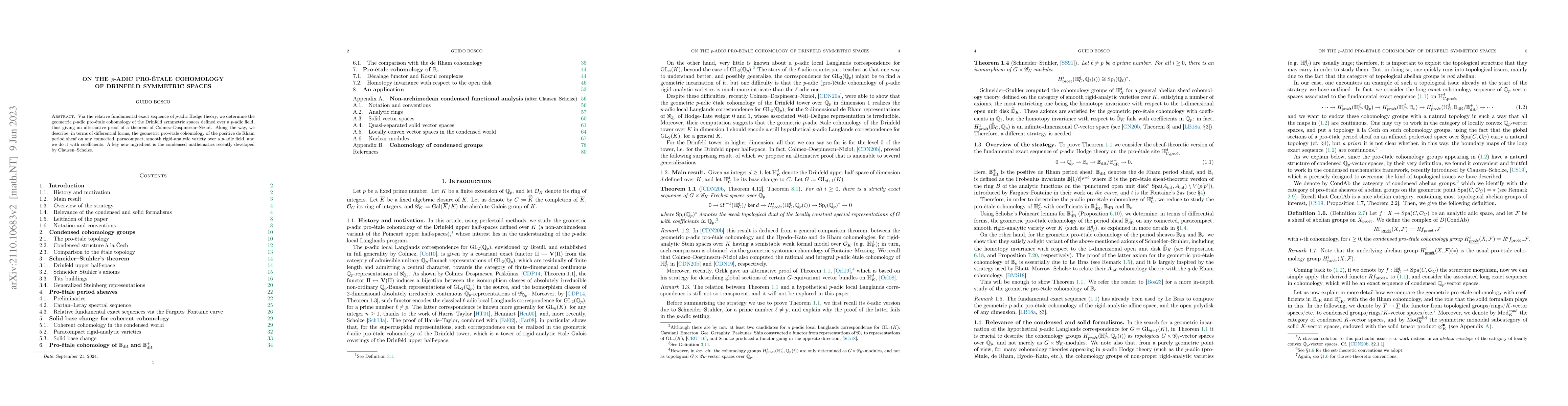 Via the relative fundamental exact sequence of $p$-adic Hodge theory, we determine the geometric $p$-adic pro-\'etale cohomology of the Drinfeld symmetric spaces defined over a $p$-adic field, thus giving an alternative proof of a theorem of Colmez-Dospinescu-Niziol. Along the way, we describe, in terms of differential forms, the geometric pro-\'etale cohomology of the positive de Rham period sheaf on any connected, paracompact, smooth rigid-analytic variety over a $p$-adic field, and we do it with coefficients. A key new ingredient is the condensed mathematics recently developed by Clausen-Scholze.