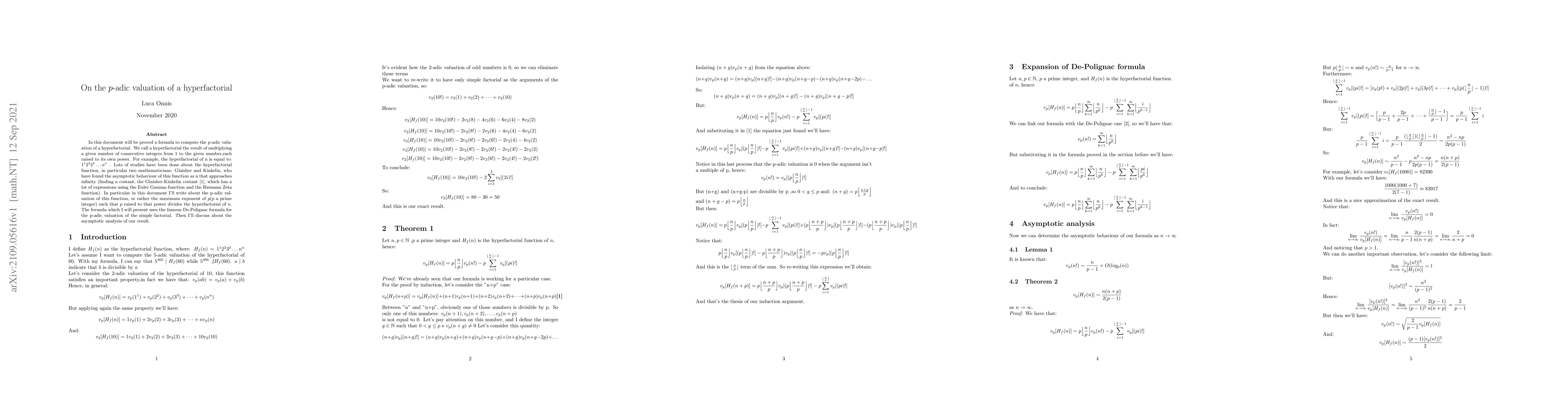 In this document will be proved a formula to compute the $p$-adic valuation of a hyperfactorial. We call a hyperfactorial the result of multiplying a given number of consecutive integers from 1 to the given number,each raised to its own power. For example, the hyperfactorial of $n$ is equal to: $1^1 2^2 3^3\dots n^n$ . Lots of studies have been done about the hyperfactorial function, in particular two mathematicians: Glaisher and Kinkelin, who have found the asymptotic behaviour of this function as $n$ that approaches infinity (finding a costant, the Glaisher-Kinkelin costant, which has a lot of expressions using the Euler Gamma function and the Riemann Zeta function). In particular in this document I'll write about the p-adic valuation of this function, or rather the maximum exponent of $p$($p$ a prime integer) such that $p$ raised to that power divides the hyperfactorial of $n$. The formula which I will present uses the famous De-Polignac formula for the $p$-adic valuation of the simple factorial. Then I'll discuss about the asymptotic analysis of our result.