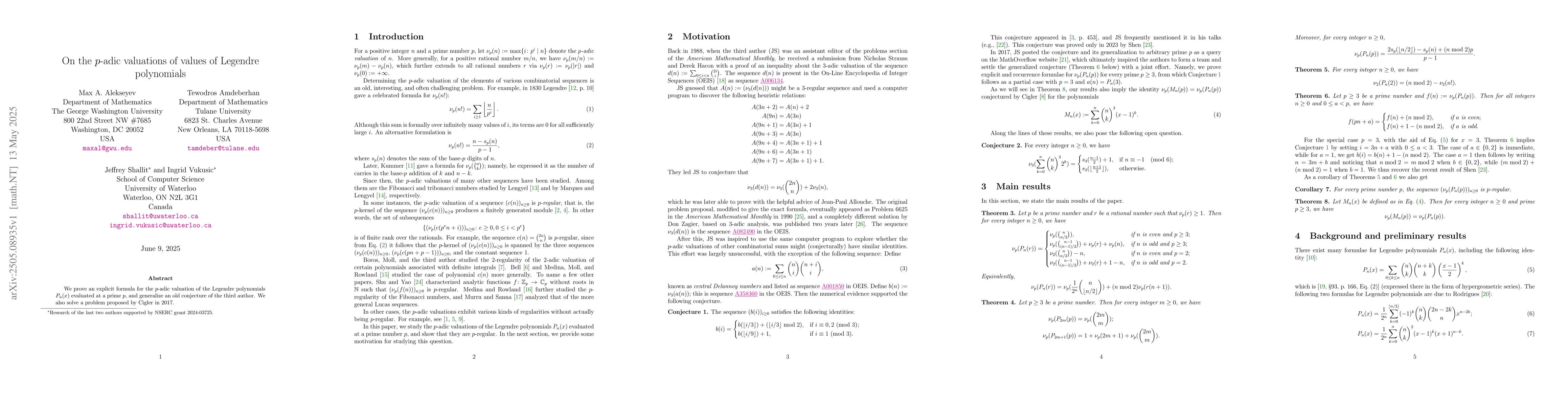 We prove an explicit formula for the $p$-adic valuation of the Legendre polynomials $P_n(x)$ evaluated at a prime $p$, and generalize an old conjecture of the third author. We also solve a problem proposed by Cigler in 2017.