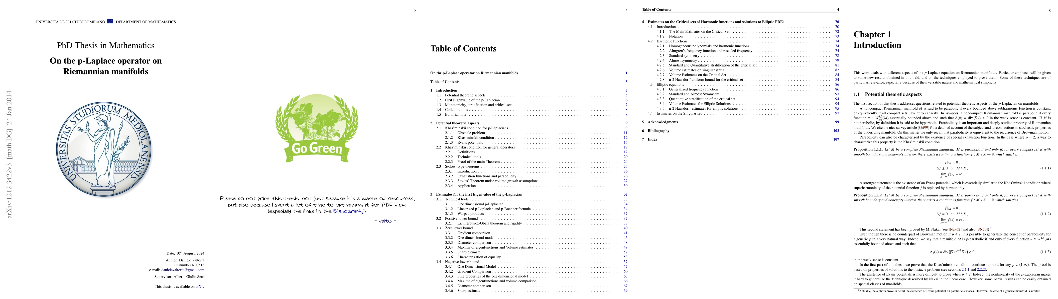 This paper explores various aspects of the p-Laplace operator on Riemannian manifolds, including potential theoretic conditions, sharp eigenvalue estimates with Ricci curvature bounds, and the critical sets of harmonic functions. It delves into the mathematical properties and implications of these operators in geometric contexts.