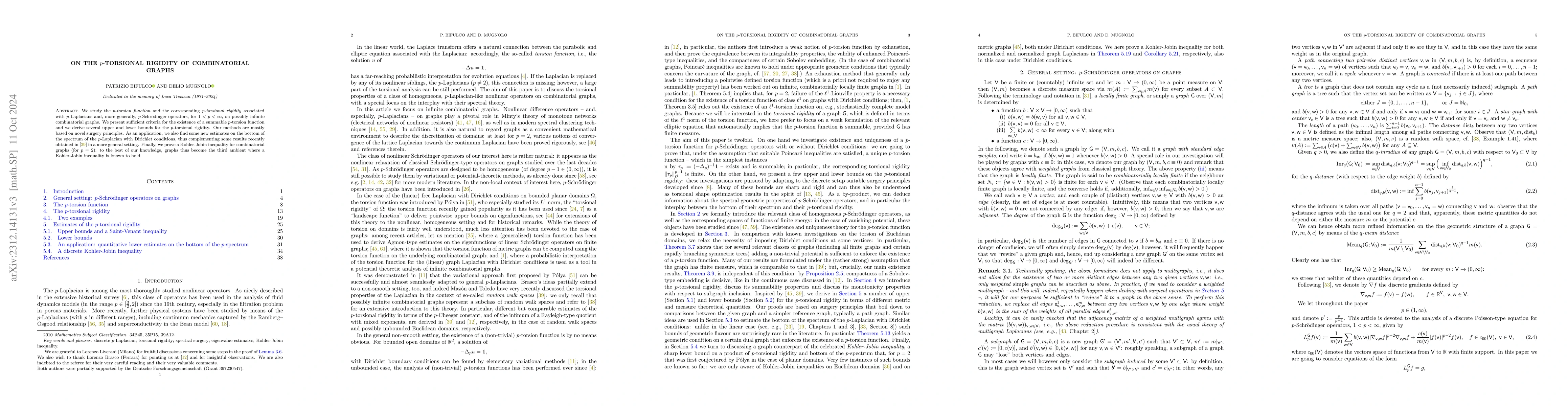 This paper explores $p$-torsion functions and $p$-torsional rigidity for $p$-Laplacians on combinatorial graphs of finite measure, providing criteria for summable $p$-torsion functions and deriving bounds for $p$-torsional rigidity using novel surgery principles. It also establishes new spectrum estimates for $p$-Laplacians and proves a Kohler-Jobin inequality for combinatorial graphs.