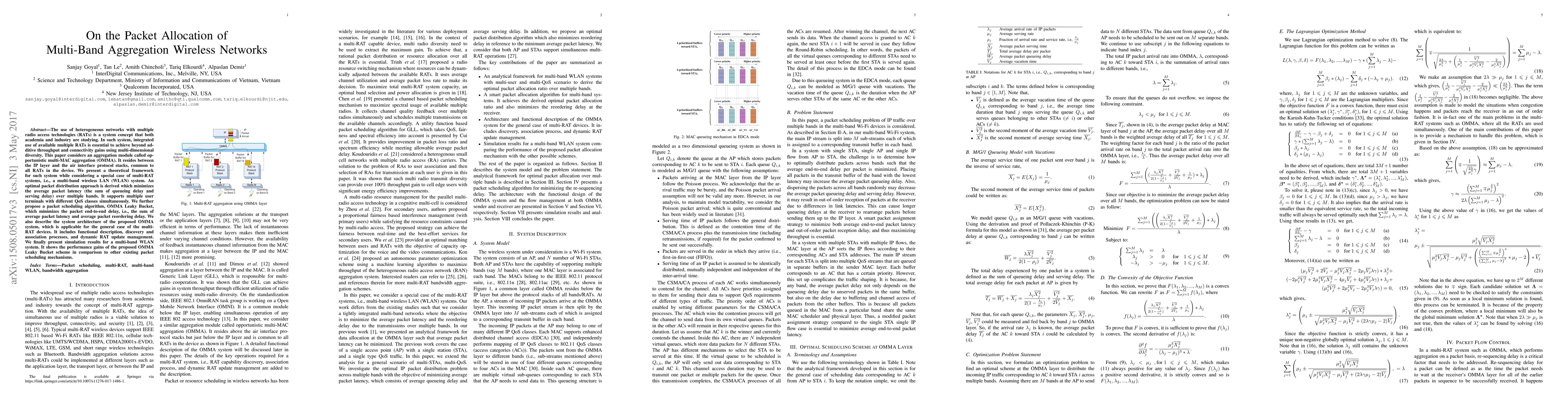 The use of heterogeneous networks with multiple radio access technologies (RATs) is a system concept that both academia and industry are studying. In such system, integrated use of available multiple RATs is essential to achieve beyond additive throughput and connectivity gains using multi-dimensional diversity. This paper considers an aggregation module called opportunistic multi-MAC aggregation (OMMA). It resides between the IP layer and the air interface protocol stacks, common to all RATs in the device. We present a theoretical framework for such system while considering a special case of multi-RAT systems, i.e., a multi-band wireless LAN (WLAN) system. An optimal packet distribution approach is derived which minimizes the average packet latency (the sum of queueing delay and serving delay) over multiple bands. It supports multiple user terminals with different QoS classes simultaneously. We further propose a packet scheduling algorithm, OMMA Leaky Bucket, which minimizes the packet end-to-end delay, i.e., the sum of average packet latency and average packet reordering delay. We also describe the system architecture of the proposed OMMA system, which is applicable for the general case of the multi- RAT devices. It includes functional description, discovery and association processes, and dynamic RAT update management. We finally present simulation results for a multi-band WLAN system. It shows the performance gains of the proposed OMMA Leaky Bucket scheme in comparison to other existing packet scheduling mechanisms.