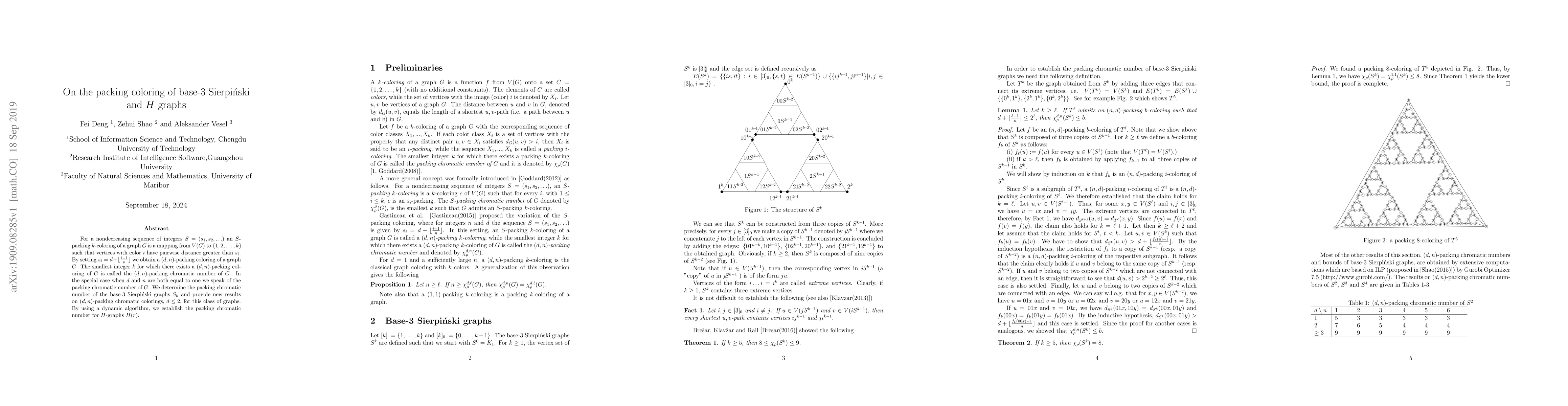 This paper determines the packing chromatic number for base-3 Sierpiński graphs and explores $(d,n)$-packing chromatic colorings for $d \le 2$. It also uses a dynamic algorithm to establish the packing chromatic number for $H$-graphs $H(r)$.