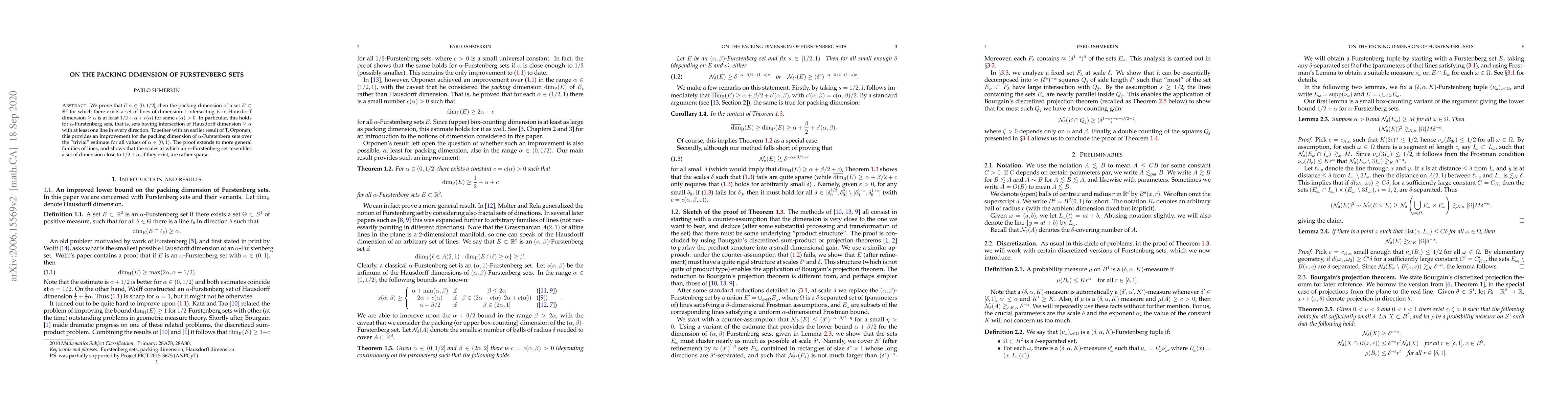 The paper proves a result about the packing dimension of Furstenberg sets using discretized versions and applying Bourgain's projection theorem. It involves constructing (δ, α, K)-Furstenberg tuples and analyzing sets at various scales.