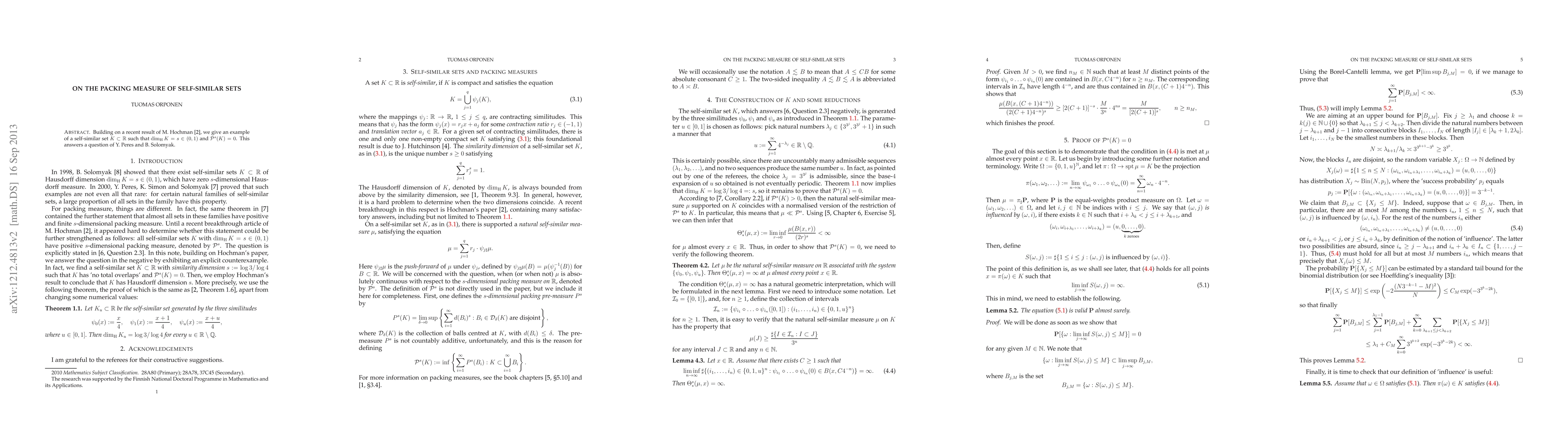 Building on a recent result of M. Hochman, we give an example of a linear self-similar set K such that 0 < dim K = s < 1 and P^s(K) = 0. This answers a question of Y. Peres and B. Solomyak.