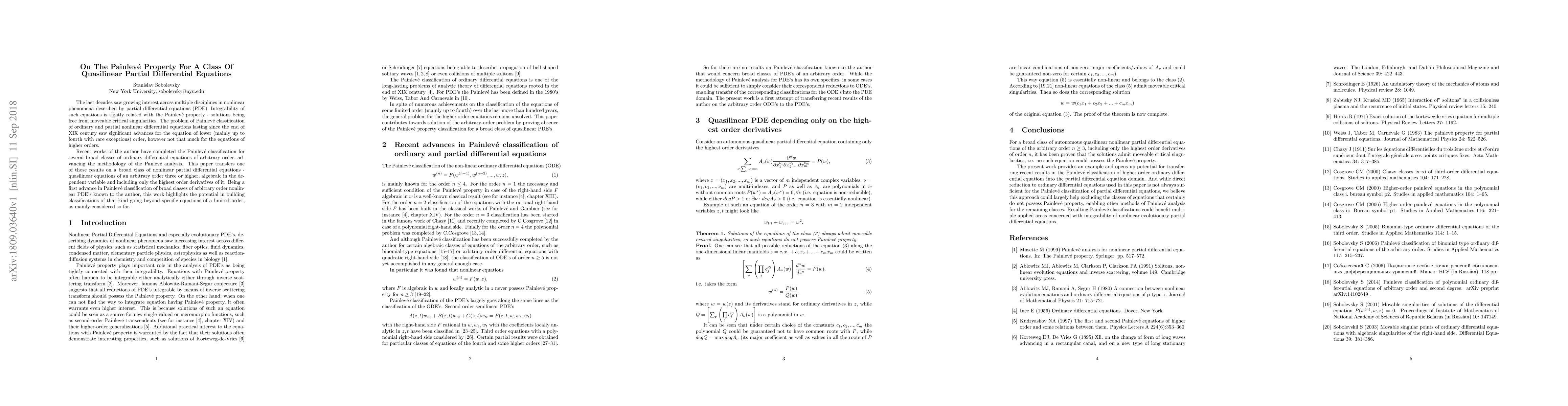 The last decades saw growing interest across multiple disciplines in nonlinear phenomena described by partial differential equations (PDE). Integrability of such equations is tightly related with the Painleve property - solutions being free from moveable critical singularities. The problem of Painleve classification of ordinary and partial nonlinear differential equations lasting since the end of XIX century saw significant advances for the equation of lower (mainly up to fourth with rare exceptions) order, however not that much for the equations of higher orders. Recent works of the author have completed the Painleve classification for several broad classes of ordinary differential equations of arbitrary order, advancing the methodology of the Panleve analysis. This paper transfers one of those results on a broad class of nonlinear partial differential equations - quasilinear equations of an arbitrary order three or higher, algebraic in the dependent variable and including only the highest order derivatives of it. Being a first advance in Painleve classification of broad classes of arbitrary order nonlinear PDE's known to the author, this work highlights the potential in building classifications of that kind going beyond specific equations of a limited order, as mainly considered so far.