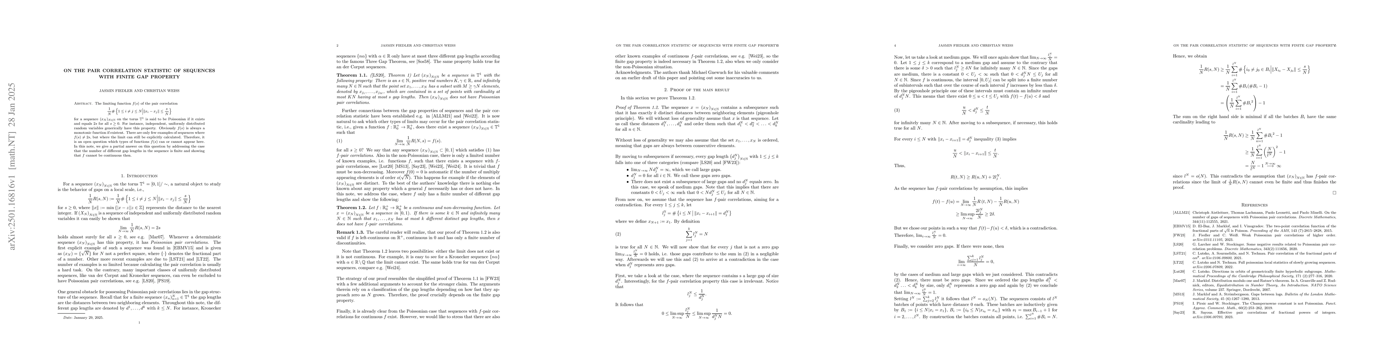 This paper investigates the pair correlation statistic of sequences with a finite gap property on the torus. It finds that when the sequence has a limited number of distinct gap lengths, the limiting function cannot be continuous, thus addressing an open question about possible forms of $f(s)$.