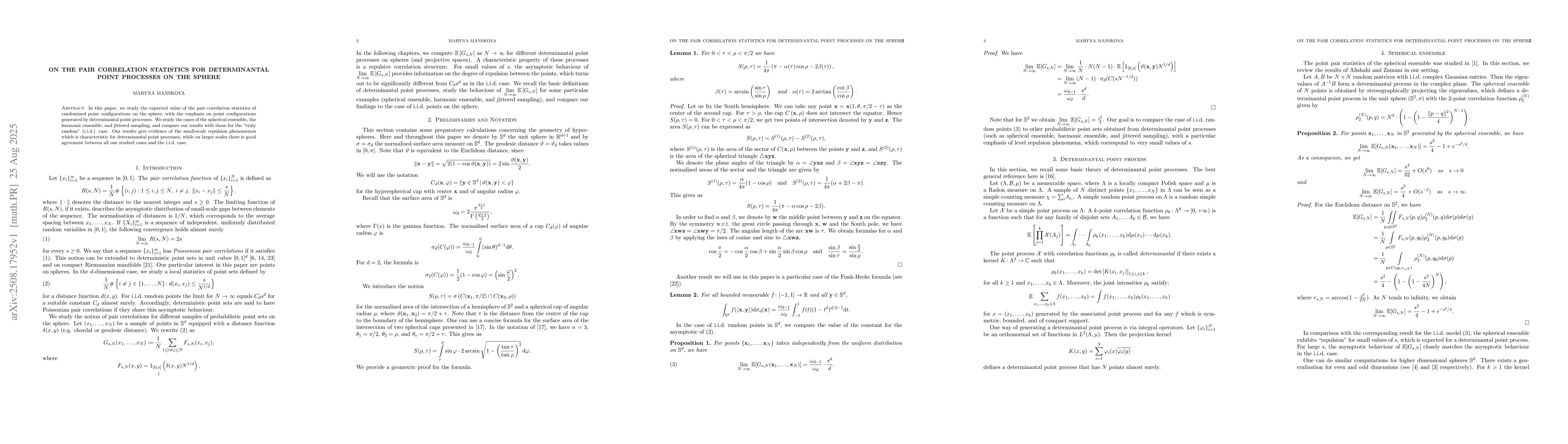 In this paper, we study the expected value of the pair correlation statistics of randomized point configurations on the sphere, with the emphasis on point configurations generated by determinantal point processes. We study the cases of the spherical ensemble, the harmonic ensemble, and jittered sampling, and compare our results with those for the ''truly random'' (i.i.d.) case. Our results give evidence of the small-scale repulsion phenomenon which is characteristic for determinantal point processes, while on larger scales there is good agreement between all our studied cases and the i.i.d. case.