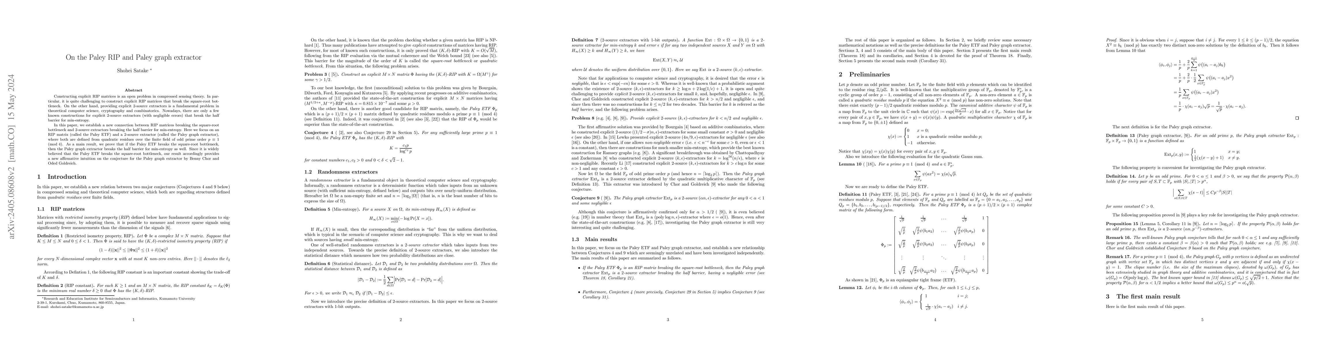 This paper establishes a novel connection between explicit Restricted Isometry Property (RIP) matrices in compressed sensing and $2$-source extractors in theoretical computer science. The authors demonstrate that if a specific Paley RIP matrix (Paley ETF) breaks the square-root bottleneck, then a Paley graph extractor also overcomes the half barrier for min-entropy, offering new support for conjectures about the extractor.