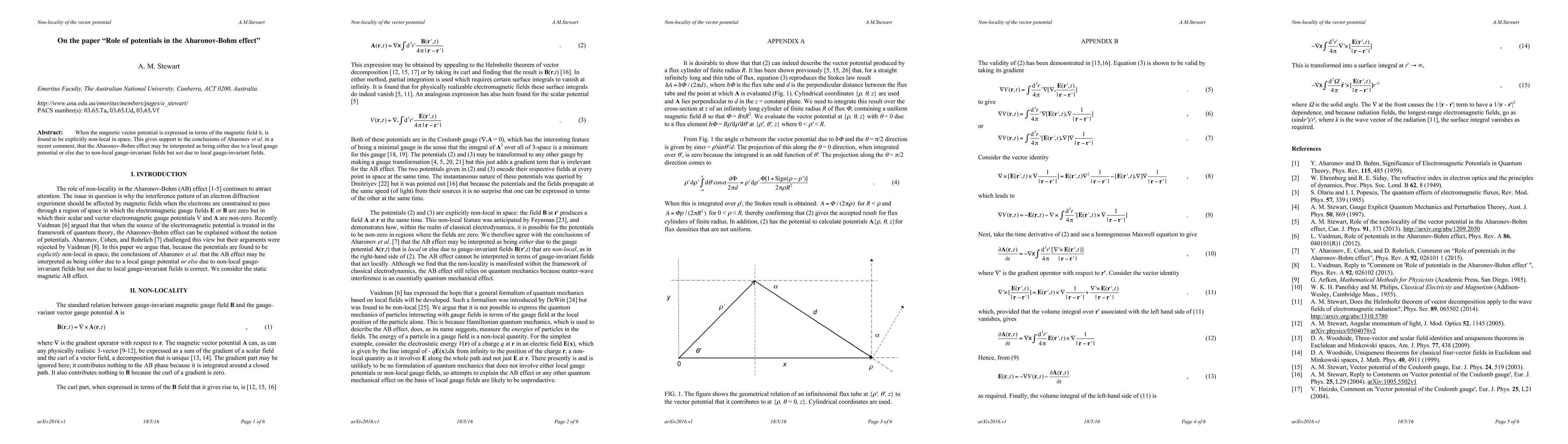 When the magnetic vector potential is expressed in terms of the magnetic field it, is found to be explicitly non-local in space. This gives support to the conclusions of Aharonov et al. in a recent comment, that the Aharonov-Bohm effect may be interpreted as being either due to a local gauge potential or else due to non-local gauge-invariant fields but not due to local gauge-invariant fields.