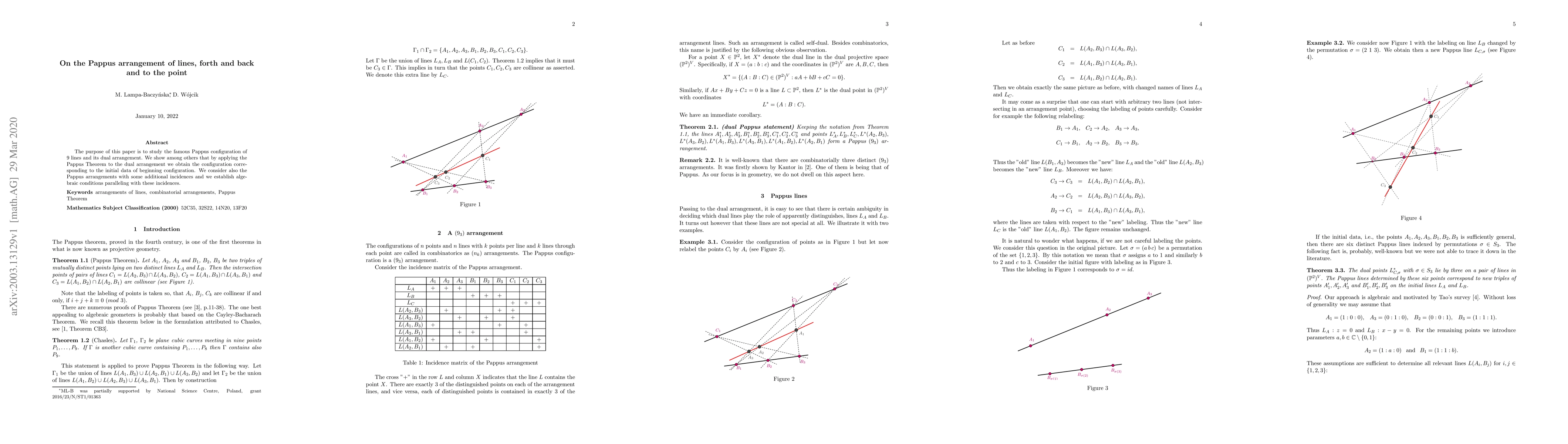 The purpose of this paper is to study the famous Pappus configuration of $9$ lines and its dual arrangement. We show among others that by applying the Pappus Theorem to the dual arrangement we obtain the configuration corresponding to the initial data of beginning configuration. We consider also the Pappus arrangements with some additional incidences and we establish algebraic conditions paralleling with these incidences.