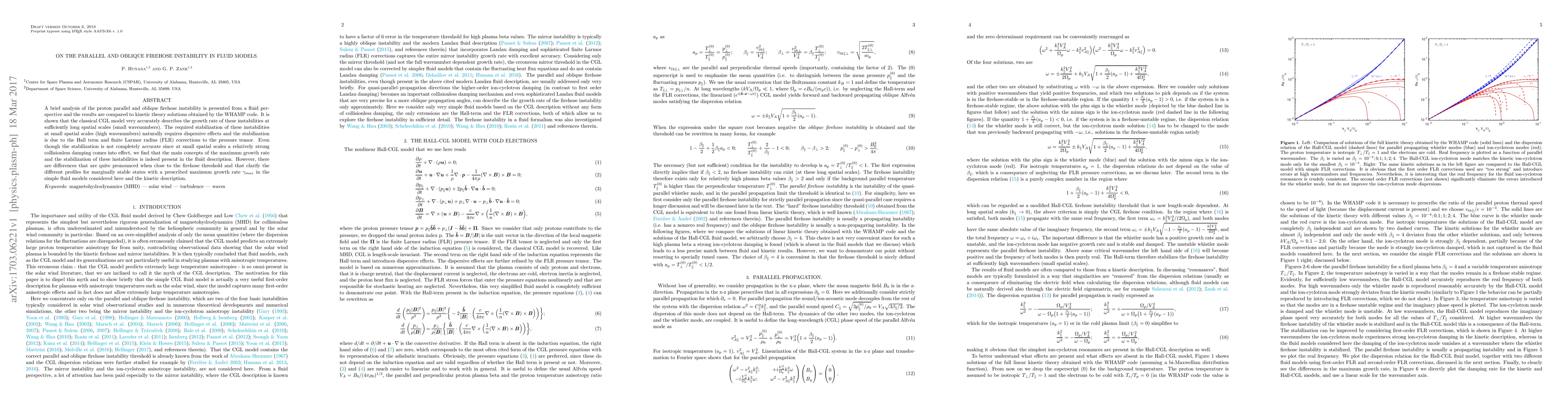 This paper analyzes the parallel and oblique firehose instabilities in fluid models, demonstrating that the classical CGL model accurately describes their growth rates at large scales. It highlights the role of dispersive effects, Hall term, and FLR corrections for stabilization at small scales, noting differences between fluid and kinetic descriptions near the firehose threshold.