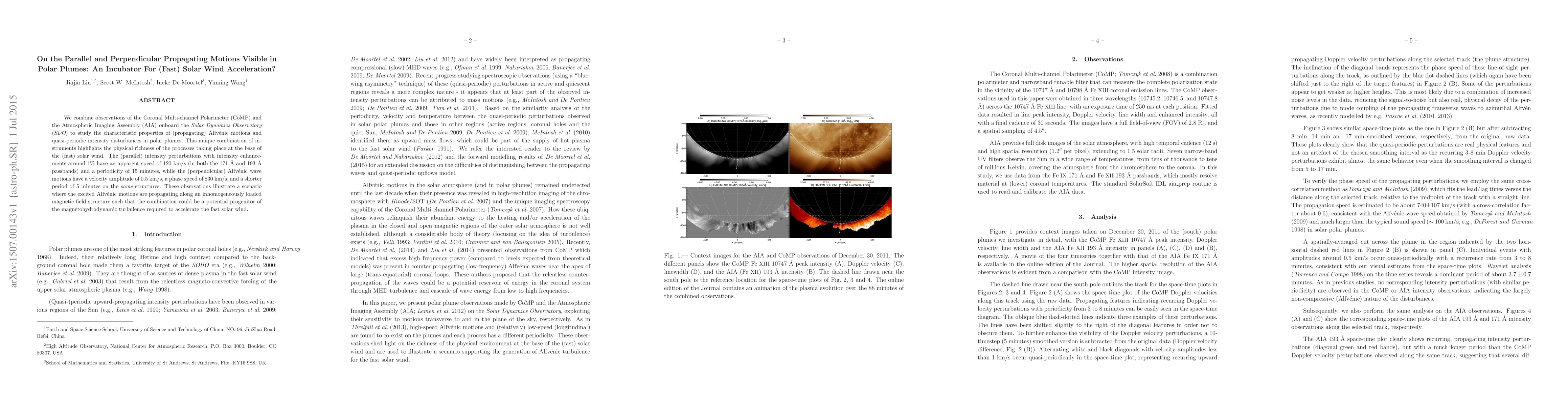 We combine observations of the Coronal Multi-channel Polarimeter (CoMP) and the Atmospheric Imaging Assembly (AIA) onboard the Solar Dynamics Observatory (SDO) to study the characteristic properties of (propagating) Alfvenic motions and quasi-periodic intensity disturbances in polar plumes. This unique combination of instruments highlights the physical richness of the processes taking place at the base of the (fast) solar wind. The (parallel) intensity perturbations with intensity enhancements around 1% have an apparent speed of 120 km/s (in both the 171A and 193A passbands) and a periodicity of 15 minutes, while the (perpendicular) Alfvenic wave motions have a velocity amplitude of 0.5 km/s, a phase speed of 830 km/s, and a shorter period of 5 minutes on the same structures. These observations illustrate a scenario where the excited Alfvenic motions are propagating along an inhomogeneously loaded magnetic field structure such that the combination could be a potential progenitor of the magnetohydrodynamic turbulence required to accelerate the fast solar wind.
