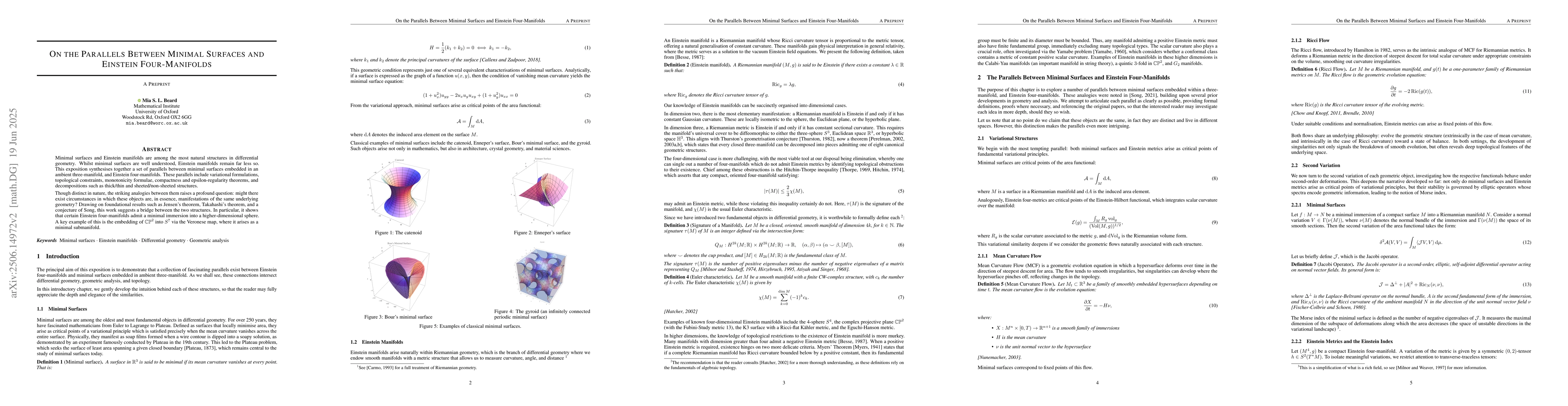 Minimal surfaces and Einstein manifolds are among the most natural structures in differential geometry. Whilst minimal surfaces are well understood, Einstein manifolds remain far less so. This exposition synthesises together a set of parallels between minimal surfaces embedded in an ambient three-manifold, and Einstein four-manifolds. These parallels include variational formulations, topological constraints, monotonicity formulae, compactness and epsilon-regularity theorems, and decompositions such as thick/thin and sheeted/non-sheeted structures. Though distinct in nature, the striking analogies between them raises a profound question: might there exist circumstances in which these objects are, in essence, manifestations of the same underlying geometry? Drawing on foundational results such as Jensen's theorem, Takahashi's theorem, and a conjecture of Song, this work suggests a bridge between the two structures. In particular, it shows that certain Einstein four-manifolds admit a minimal immersion into a higher-dimensional sphere. A key example of this is the embedding of $\mathbb{CP}^{2}$ into $S^{7}$ via the Veronese map, where it arises as a minimal submanifold.