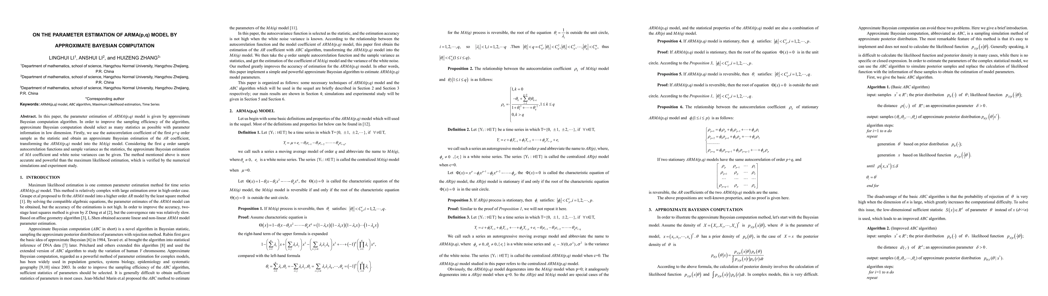 This paper proposes an approximate Bayesian computation algorithm to estimate parameters in ARMA(p,q) models, using selected autocorrelation statistics to improve efficiency. The method is shown to be more accurate than maximum likelihood estimation through simulations and experiments.