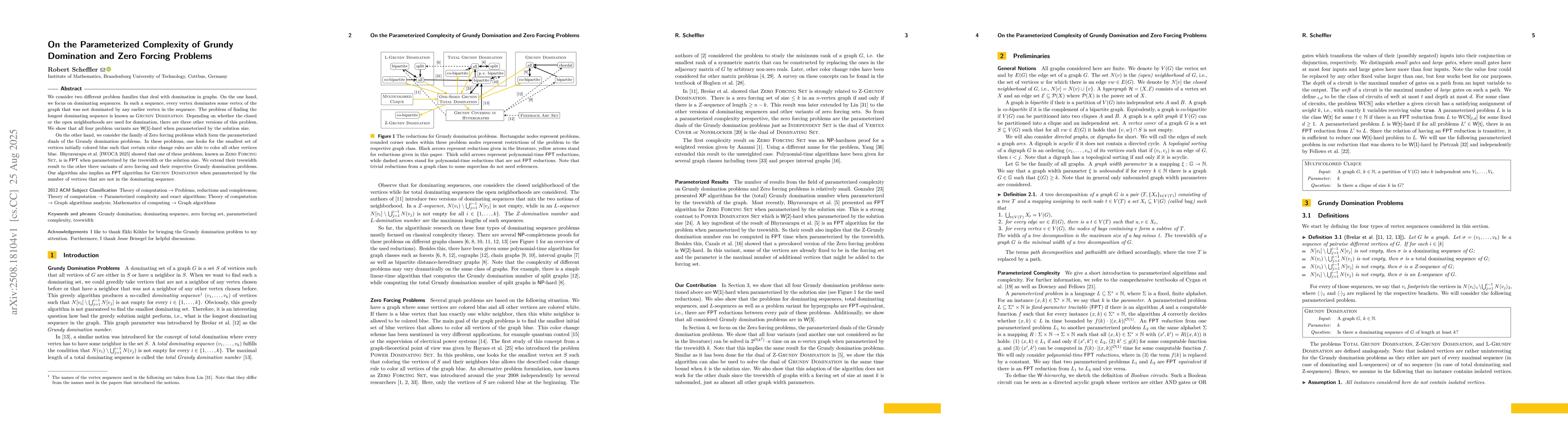We consider two different problem families that deal with domination in graphs. On the one hand, we focus on dominating sequences. In such a sequence, every vertex dominates some vertex of the graph that was not dominated by any earlier vertex in the sequence. The problem of finding the longest dominating sequence is known as $\mathsf{Grundy~Domination}$. Depending on whether the closed or the open neighborhoods are used for domination, there are three other versions of this problem. We show that all four problem variants are $\mathsf{W[1]}$-hard when parameterized by the solution size. On the other hand, we consider the family of Zero forcing problems which form the parameterized duals of the Grundy domination problems. In these problems, one looks for the smallest set of vertices initially colored blue such that certain color change rules are able to color all other vertices blue. Bhyravarapu et al. [IWOCA 2025] showed that one of these problems, known as $\mathsf{Zero~Forcing~Set}$, is in $\mathsf{FPT}$ when parameterized by the treewidth or the solution size. We extend their treewidth result to the other three variants of zero forcing and their respective Grundy domination problems. Our algorithm also implies an $\mathsf{FPT}$ algorithm for $\mathsf{Grundy~Domination}$ when parameterized by the number of vertices that are not in the dominating sequence.