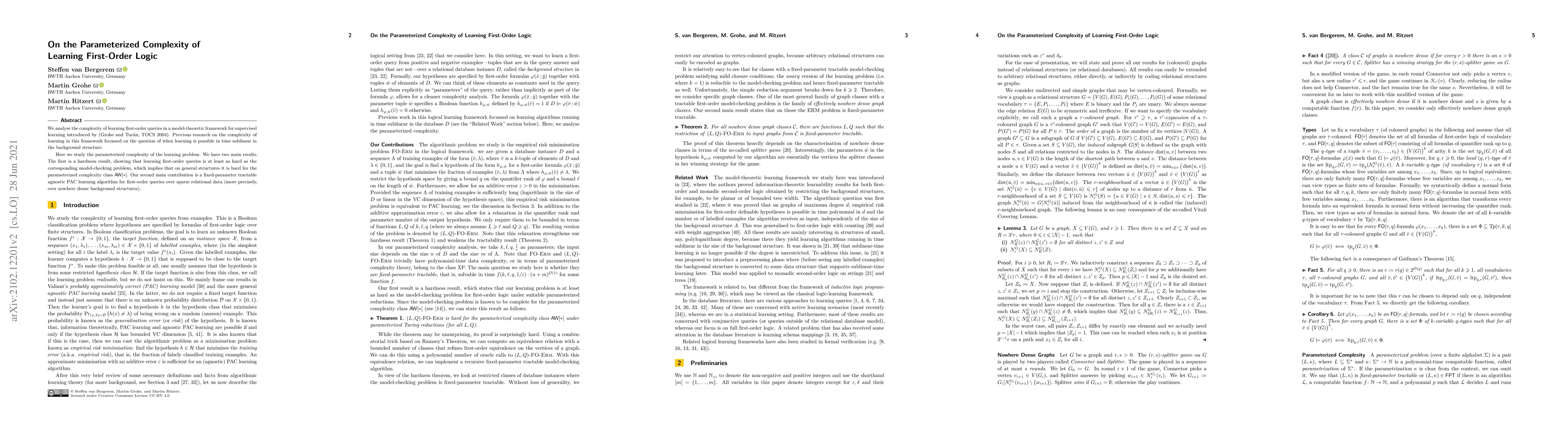 This paper investigates the parameterized complexity of learning first-order logic queries in supervised learning, establishing that learning is as hard as the model-checking problem, classifying it under the AW[*] class for general structures. It also presents a fixed-parameter tractable agnostic PAC learning algorithm for first-order queries over sparse relational data.
