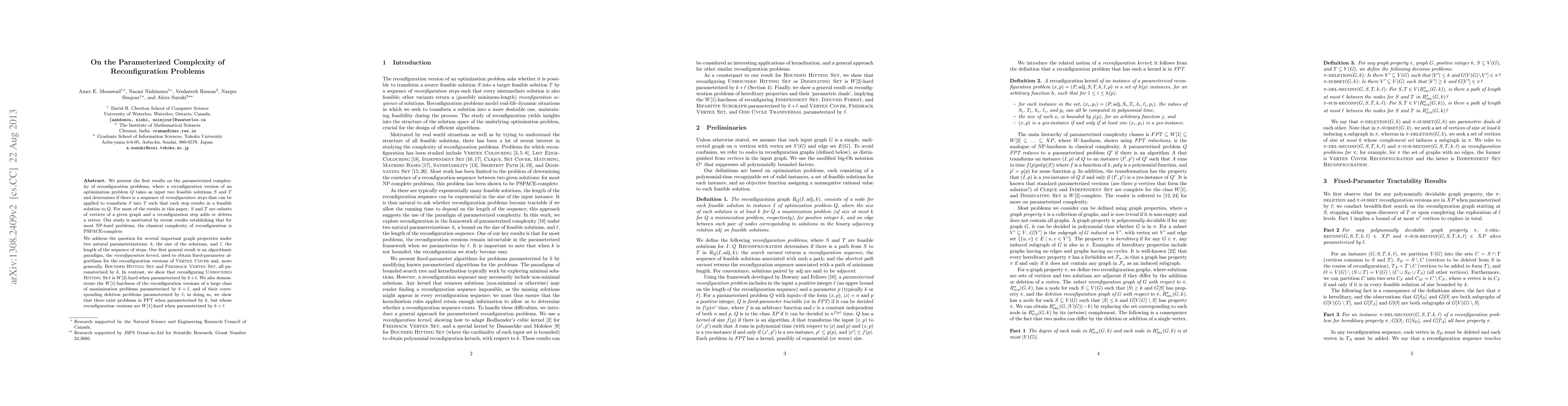 We present the first results on the parameterized complexity of reconfiguration problems, where a reconfiguration version of an optimization problem $Q$ takes as input two feasible solutions $S$ and $T$ and determines if there is a sequence of {\em reconfiguration steps} that can be applied to transform $S$ into $T$ such that each step results in a feasible solution to $Q$. For most of the results in this paper, $S$ and $T$ are subsets of vertices of a given graph and a reconfiguration step adds or deletes a vertex. Our study is motivated by recent results establishing that for most NP-hard problems, the classical complexity of reconfiguration is PSPACE-complete. We address the question for several important graph properties under two natural parameterizations: $k$, the size of the solutions, and $\ell$, the length of the sequence of steps. Our first general result is an algorithmic paradigm, the {\em reconfiguration kernel}, used to obtain fixed-parameter algorithms for the reconfiguration versions of {\sc Vertex Cover} and, more generally, {\sc Bounded Hitting Set} and {\sc Feedback Vertex Set}, all parameterized by $k$. In contrast, we show that reconfiguring {\sc Unbounded Hitting Set} is $W[2]$-hard when parameterized by $k+\ell$. We also demonstrate the $W[1]$-hardness of the reconfiguration versions of a large class of maximization problems parameterized by $k+\ell$, and of their corresponding deletion problems parameterized by $\ell$; in doing so, we show that there exist problems in FPT when parameterized by $k$, but whose reconfiguration versions are $W[1]$-hard when parameterized by $k+\ell$.