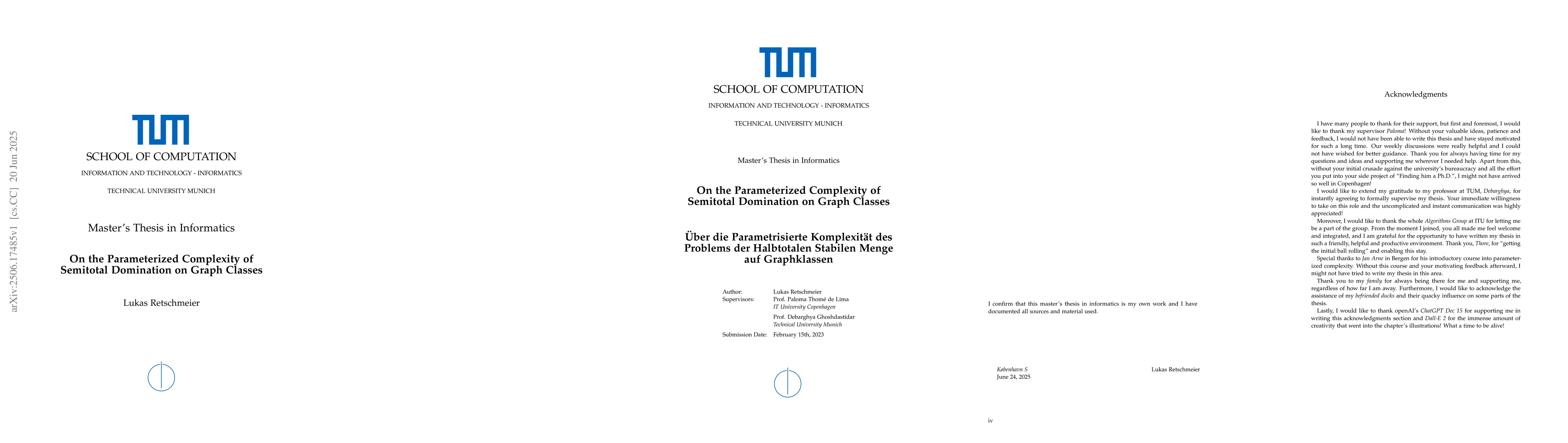 The research paper explores the complexity of finding minimum semitotal dominating sets in graphs, proving it W[2]-hard for bipartite and split graphs when parameterized by solution size. A linear kernel of size 358k is achieved for planar graphs, complementing existing linear kernels for various dominating set variants.