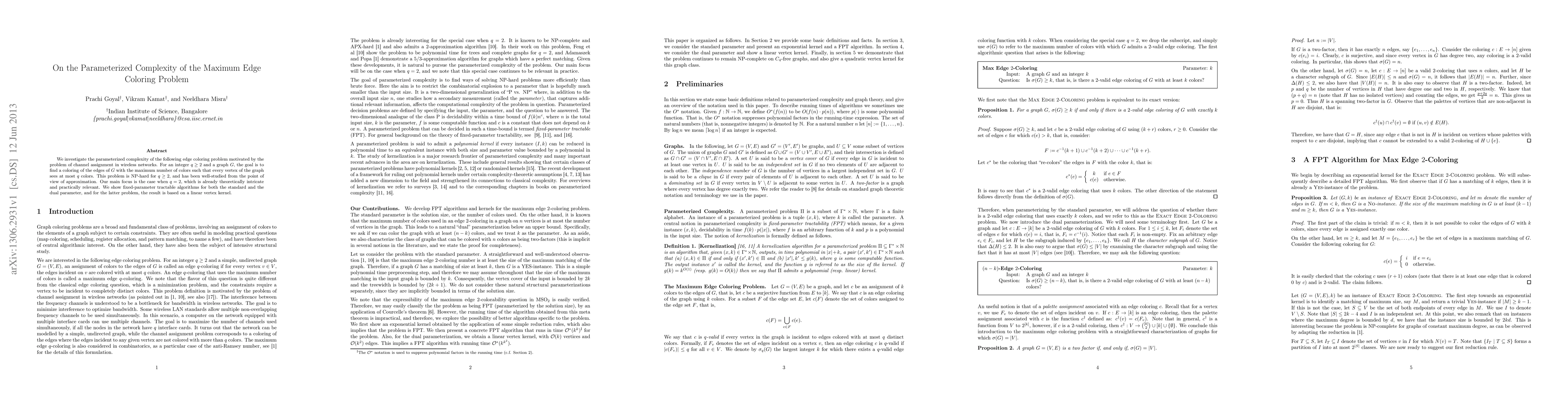 This paper explores the parameterized complexity of the maximum edge coloring problem, focusing on the case where each vertex sees at most two colors. It presents fixed-parameter tractable algorithms for both standard and dual parameters, with a linear vertex kernel for the dual parameter.