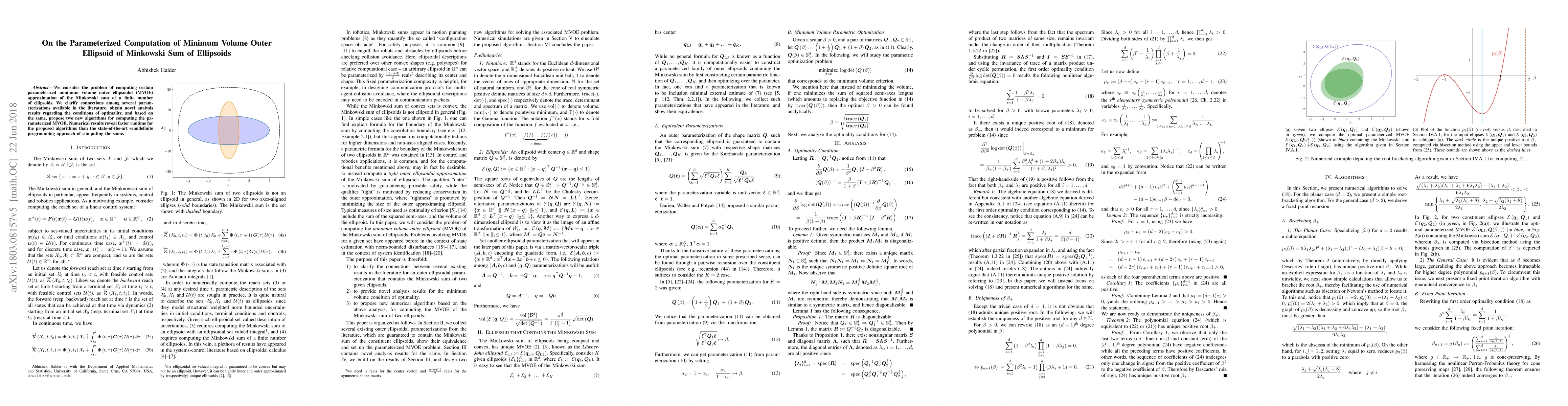 We consider the problem of computing certain parameterized minimum volume outer ellipsoidal (MVOE) approximation of the Minkowski sum of a finite number of ellipsoids. We clarify connections among several parameterizations available in the literature, obtain novel analysis results regarding the conditions of optimality, and based on the same, propose two new algorithms for computing the parameterized MVOE. Numerical results reveal faster runtime for the proposed algorithms than the state-of-the-art semidefinite programming approach of computing the same.