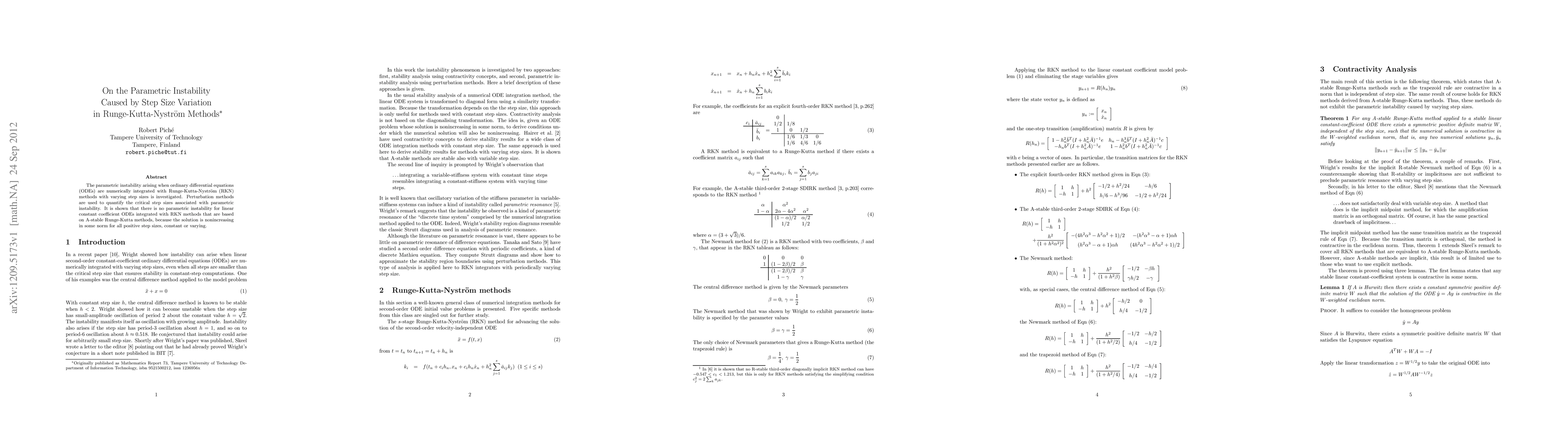 This paper investigates the parametric instability in Runge-Kutta-Nyström (RKN) methods when step sizes vary during numerical integration of ordinary differential equations (ODEs). It demonstrates that RKN methods based on A-stable Runge-Kutta methods maintain nonincreasing solutions in some norm for all positive step sizes, and uses perturbation methods to determine critical step sizes for instability.