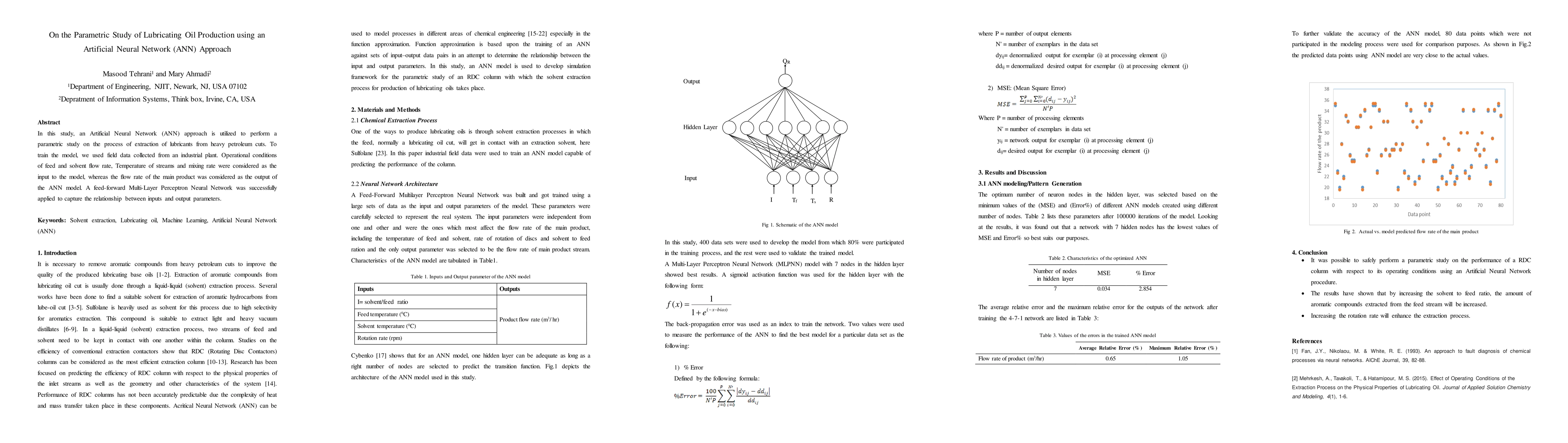 This study employs an Artificial Neural Network (ANN) to analyze the extraction process of lubricants from heavy petroleum cuts, utilizing field data for training. The model uses operational conditions like feed and solvent flow rates, temperature, and mixing rate as inputs, predicting the main product's flow rate.