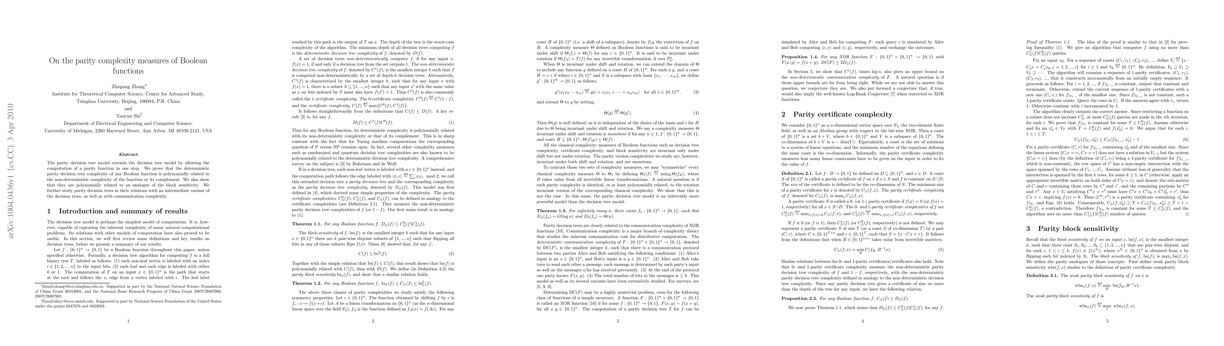 The paper investigates parity decision tree complexity of Boolean functions, showing that deterministic and non-deterministic complexities are polynomially related to each other and to block sensitivity. It also explores connections between parity decision trees and communication complexity.