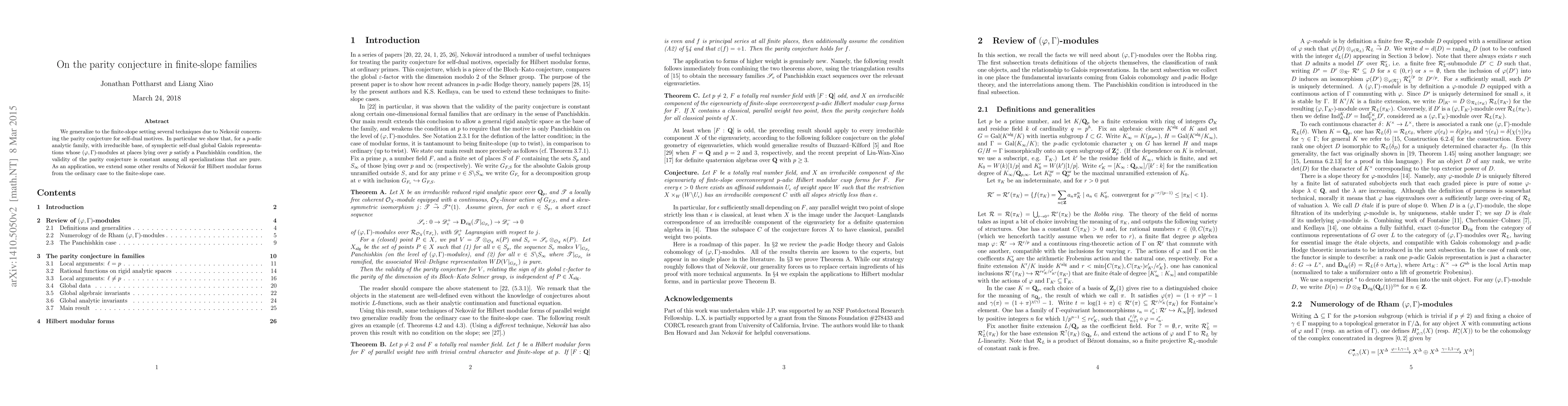 We generalize to the finite-slope setting several techniques due to Nekovar concerning the parity conjecture for self-dual motives. In particular we show that, for a $p$-adic analytic family, with irreducible base, of symplectic self-dual global Galois representations whose $(\varphi,\Gamma)$-modules at places lying over $p$ satisfy a Panchishkin condition, the validity of the parity conjecture is constant among all specializations that are pure. As an application, we extend some other results of Nekovar for Hilbert modular forms from the ordinary case to the finite-slope case.