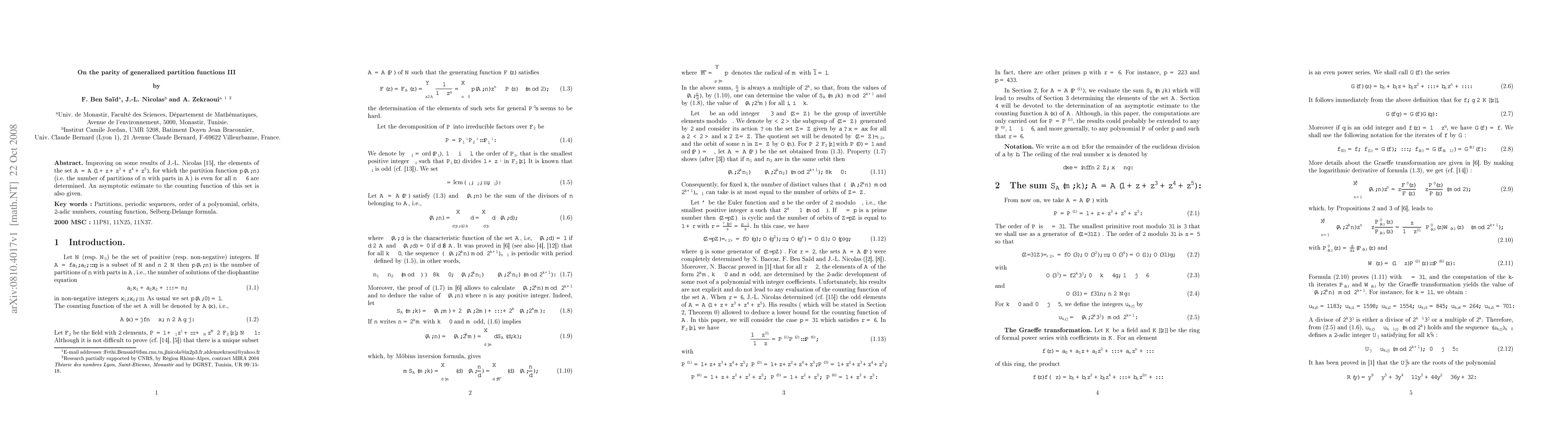 Improving on some results of J.-L. Nicolas \cite {Ndeb}, the elements of the set ${\cal A}={\cal A}(1+z+z^3+z^4+z^5)$, for which the partition function $p({\cal A},n)$ (i.e. the number of partitions of $n$ with parts in ${\cal A}$) is even for all $n\geq 6$ are determined. An asymptotic estimate to the counting function of this set is also given.
