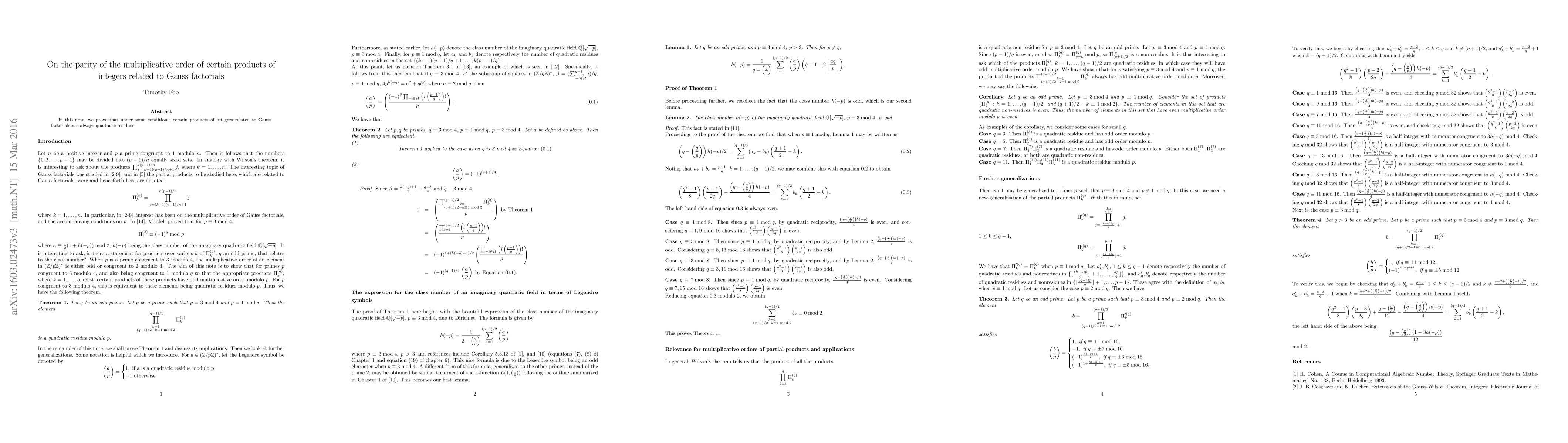 Summary: This paper demonstrates that specific products of integers connected to Gauss factorials are consistently quadratic residues under certain conditions, providing a proof of their parity.