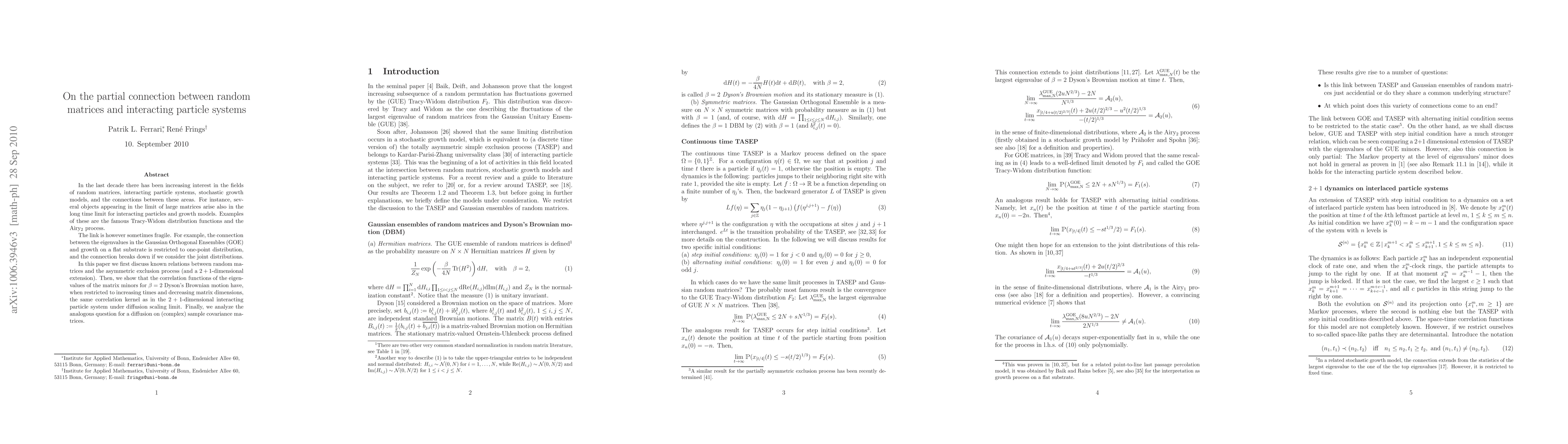 In the last decade there has been increasing interest in the fields of random matrices, interacting particle systems, stochastic growth models, and the connections between these areas. For instance, several objects appearing in the limit of large matrices arise also in the long time limit for interacting particles and growth models. Examples of these are the famous Tracy-Widom distribution functions and the Airy_2 process. The link is however sometimes fragile. For example, the connection between the eigenvalues in the Gaussian Orthogonal Ensembles (GOE) and growth on a flat substrate is restricted to one-point distribution, and the connection breaks down if we consider the joint distributions. In this paper we first discuss known relations between random matrices and the asymmetric exclusion process (and a 2+1 dimensional extension). Then, we show that the correlation functions of the eigenvalues of the matrix minors for beta=2 Dyson's Brownian motion have, when restricted to increasing times and decreasing matrix dimensions, the same correlation kernel as in the 2+1 dimensional interacting particle system under diffusion scaling limit. Finally, we analyze the analogous question for a diffusion on (complex) sample covariance matrices.