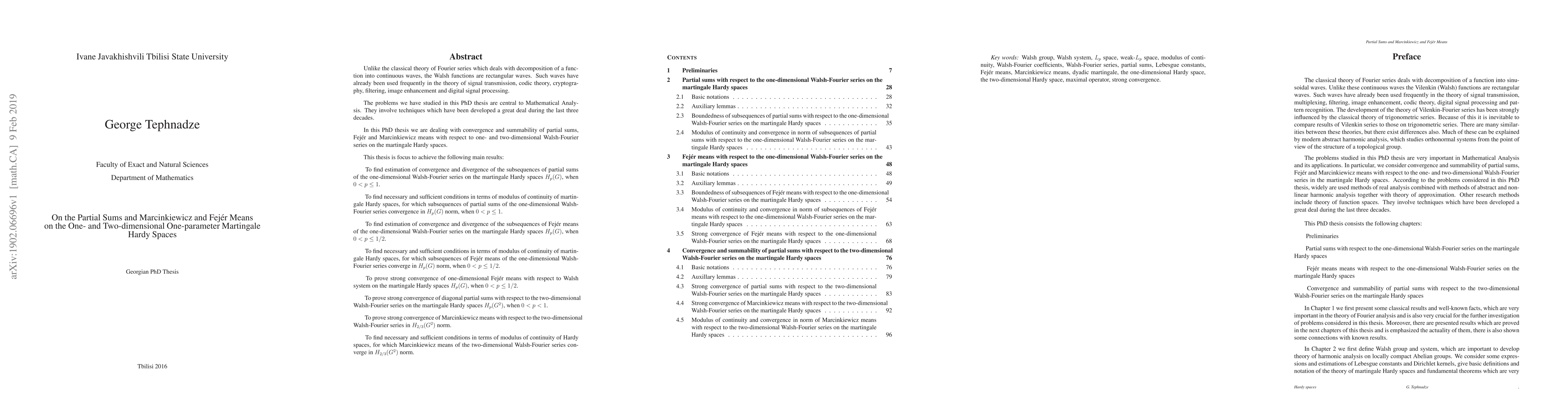 In this PhD thesis we are dealing with convergence and summability of partial sums, Fej\'er and Marcinkiewicz means with respect to one- and two-dimensional Walsh-Fourier series on the martingale Hardy spaces. This thesis is focus to achieve the following main results: To find estimation of convergence and divergence of the subsequences of partial sums of the one-dimensional Walsh-Fourier series on the martingale Hardy spaces $H_p(G)$, when $0